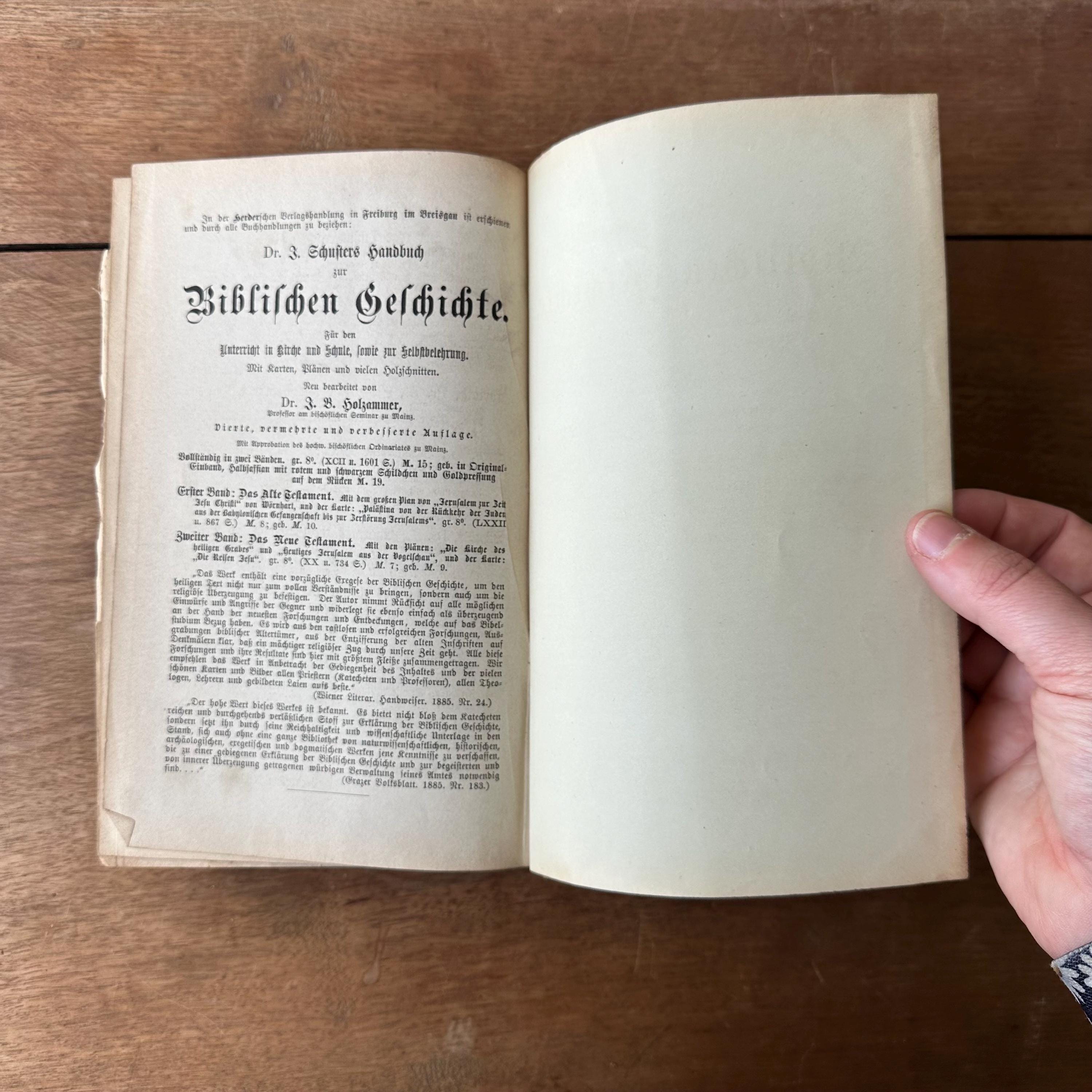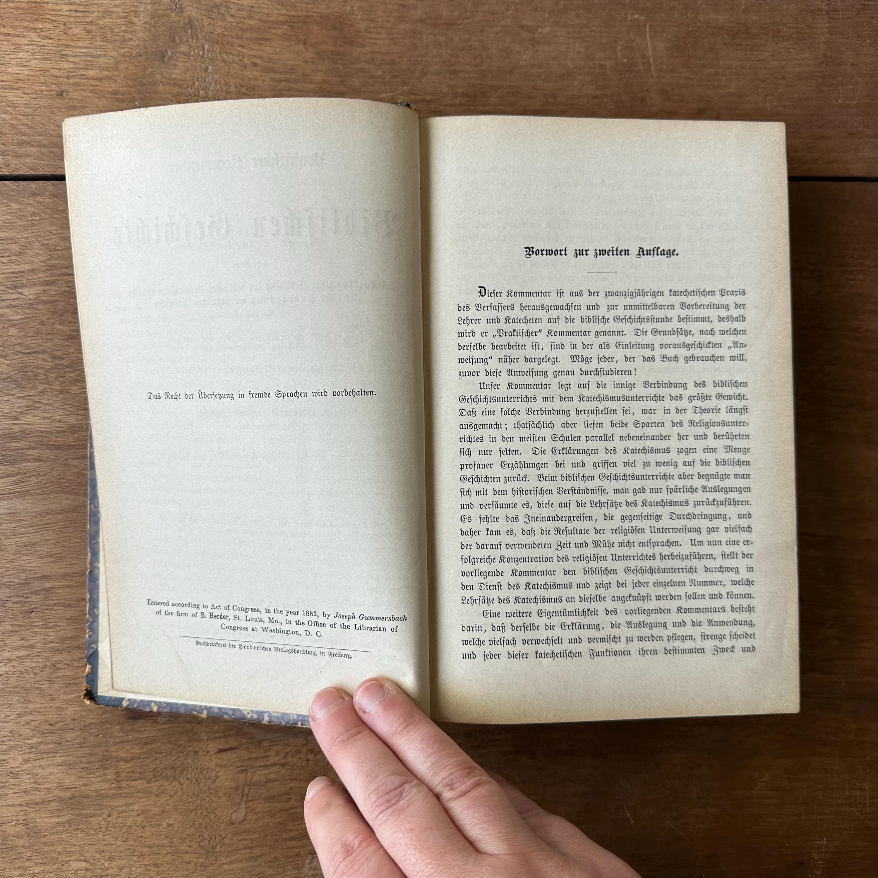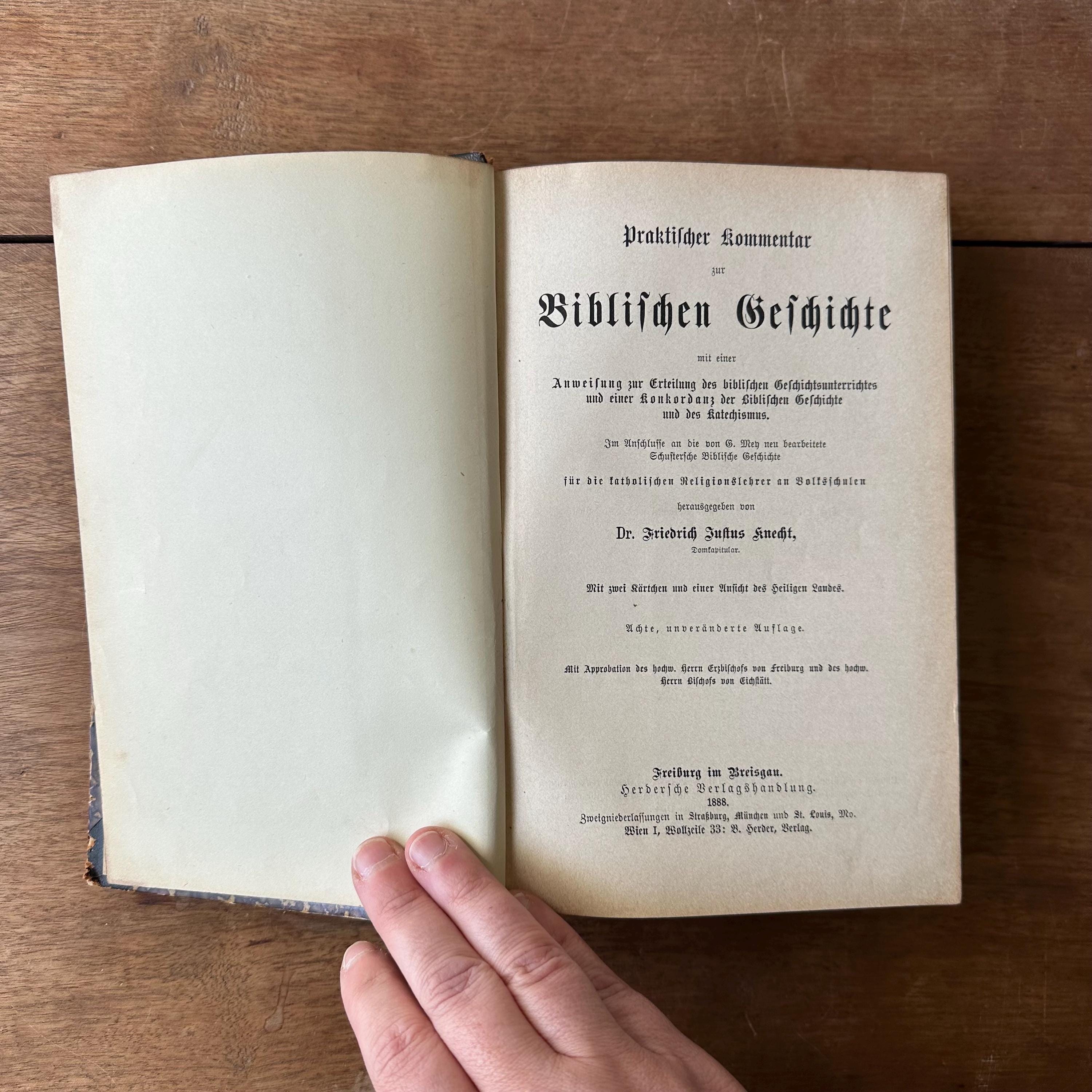 This is the 1888 edition of Praktischer Kommentar zur Biblischen Geschichre by Dr. Friedrich Justus Knecht, published by Herder Publishing House. It is a a practical commentary on biblical history to help with the teaching of biblical history. It has brown, black, and gold marbled covers with a dark brown leather spine. The spine is lettered and decorated in gold. There are 790 pages with several fold out pages for a scope and sequence of lessons at the end.