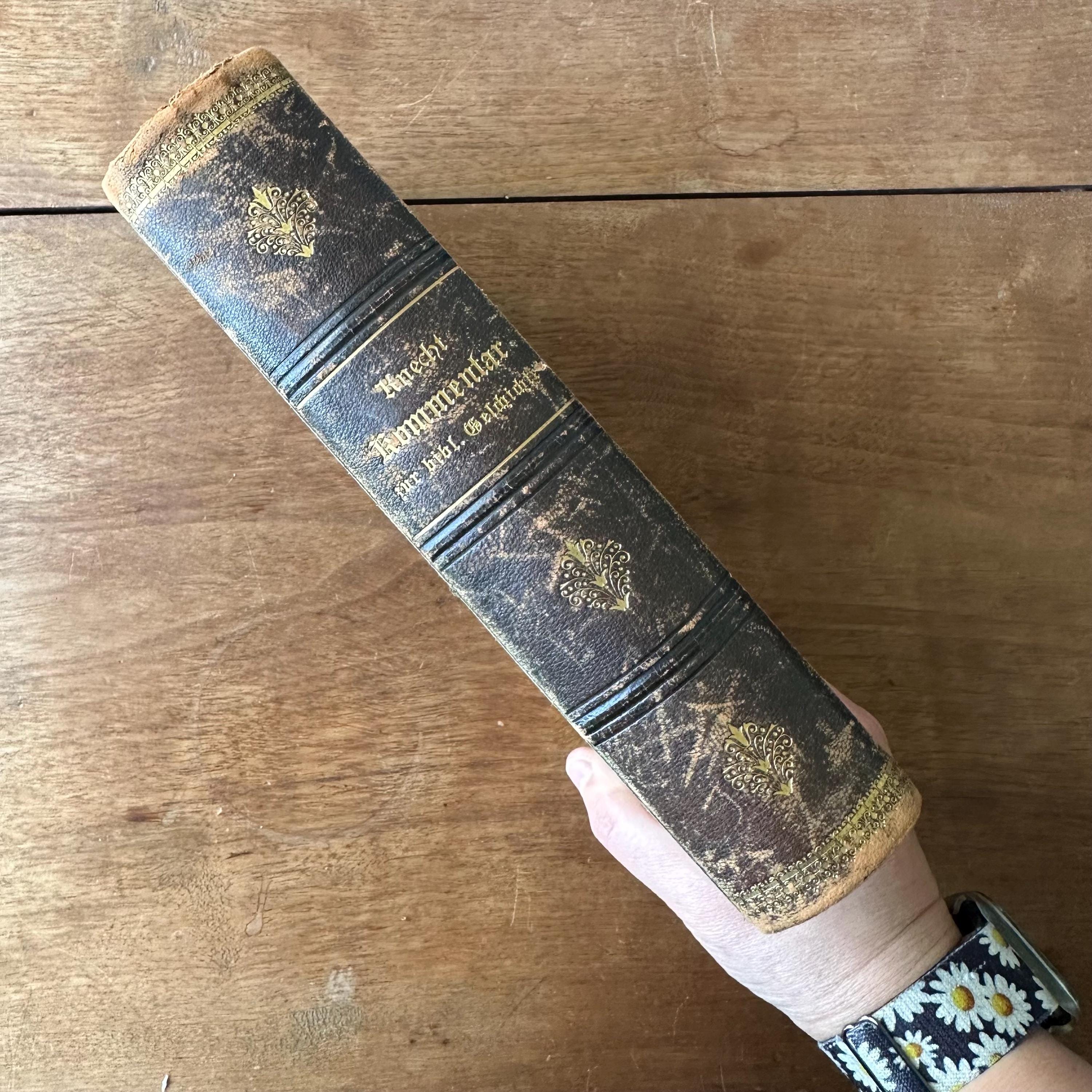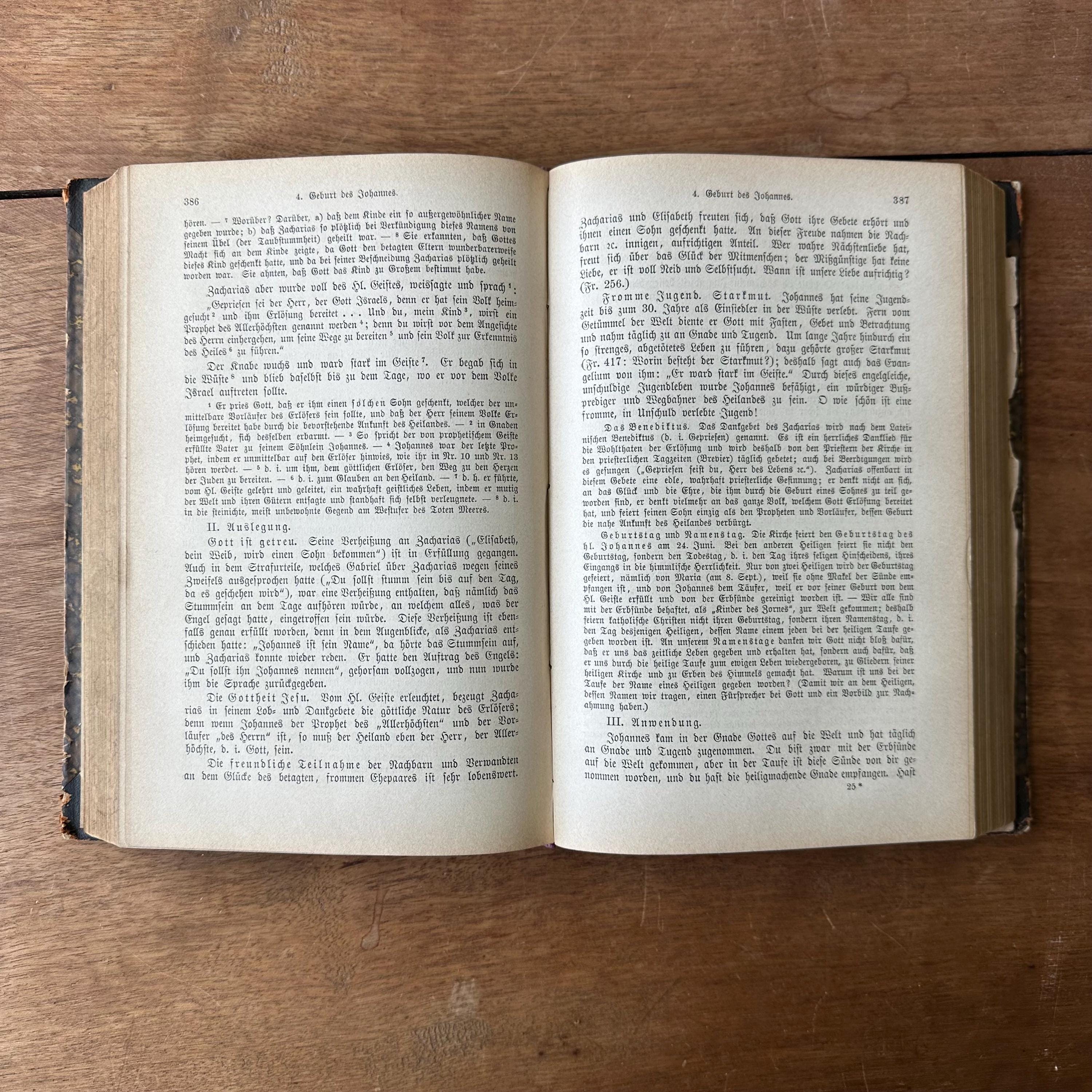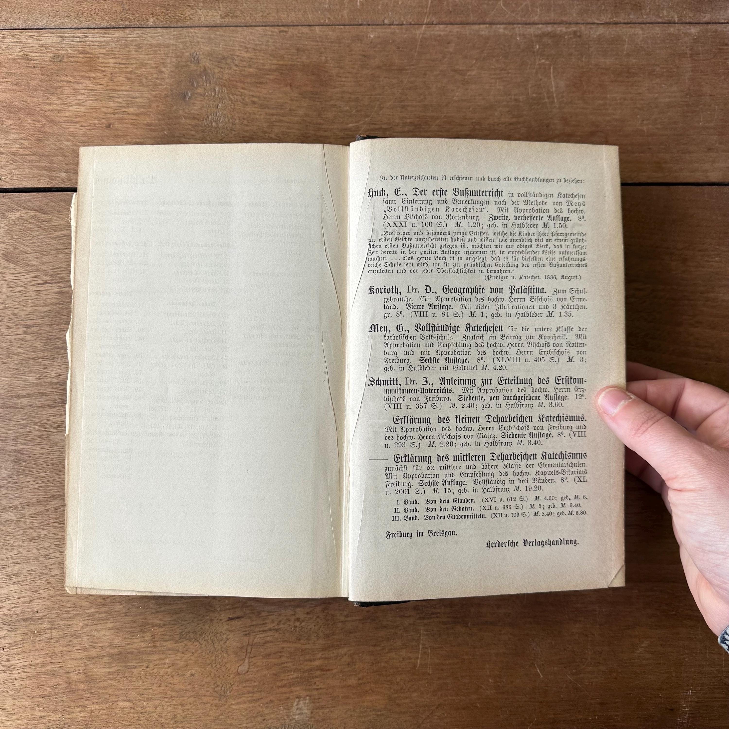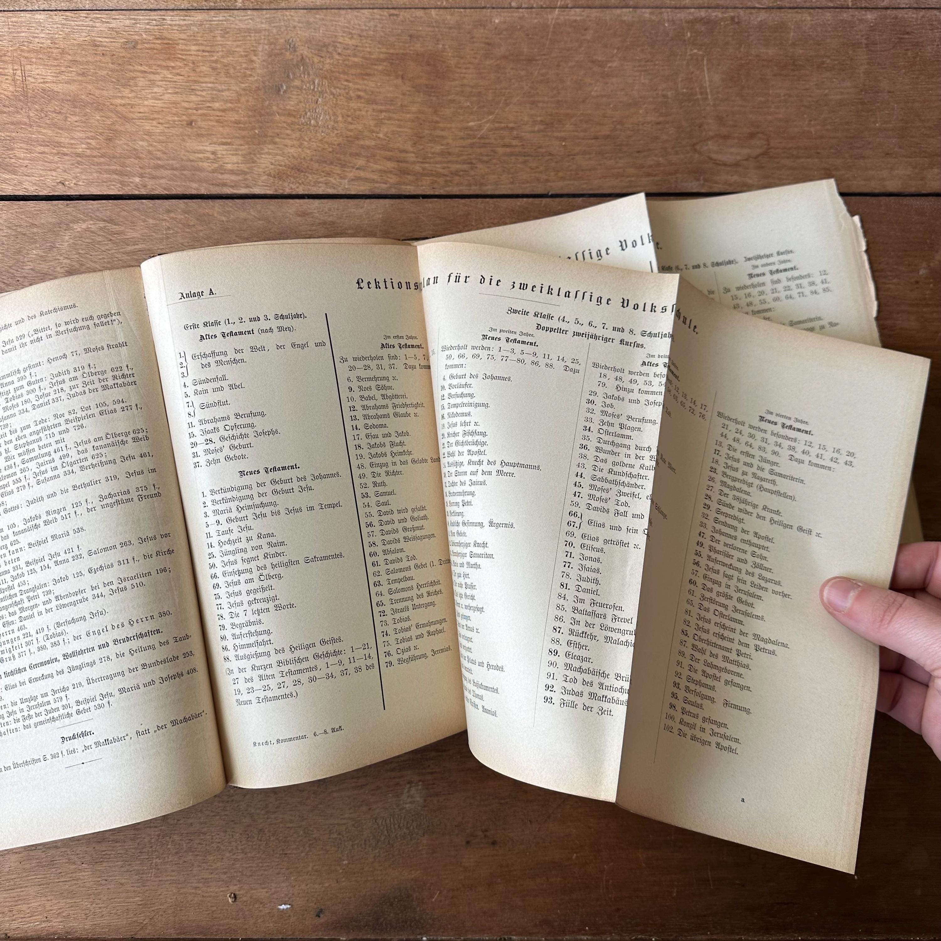 This is the 1888 edition of Praktischer Kommentar zur Biblischen Geschichre by Dr. Friedrich Justus Knecht, published by Herder Publishing House. It is a a practical commentary on biblical history to help with the teaching of biblical history. It has brown, black, and gold marbled covers with a dark brown leather spine. The spine is lettered and decorated in gold. There are 790 pages with several fold out pages for a scope and sequence of lessons at the end.