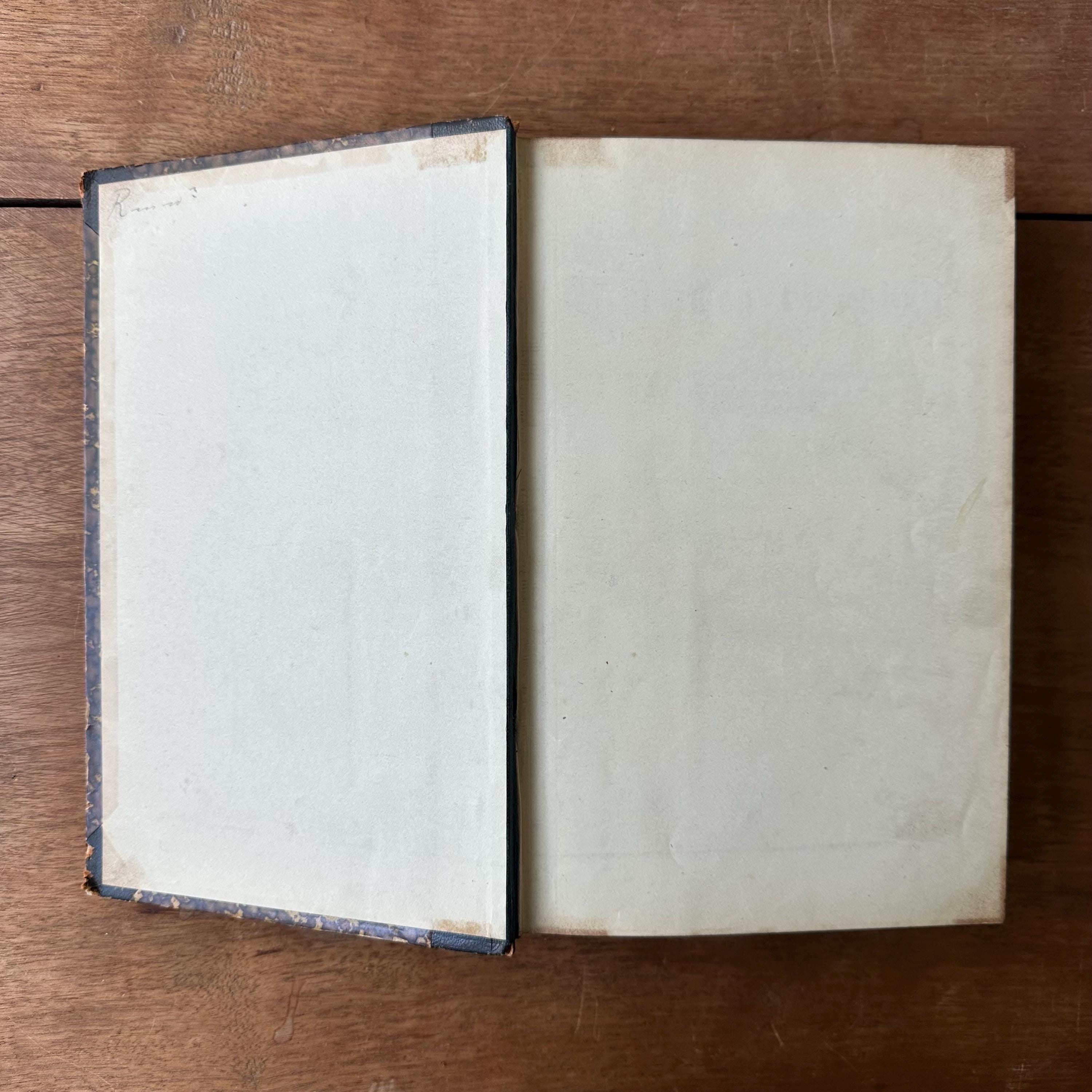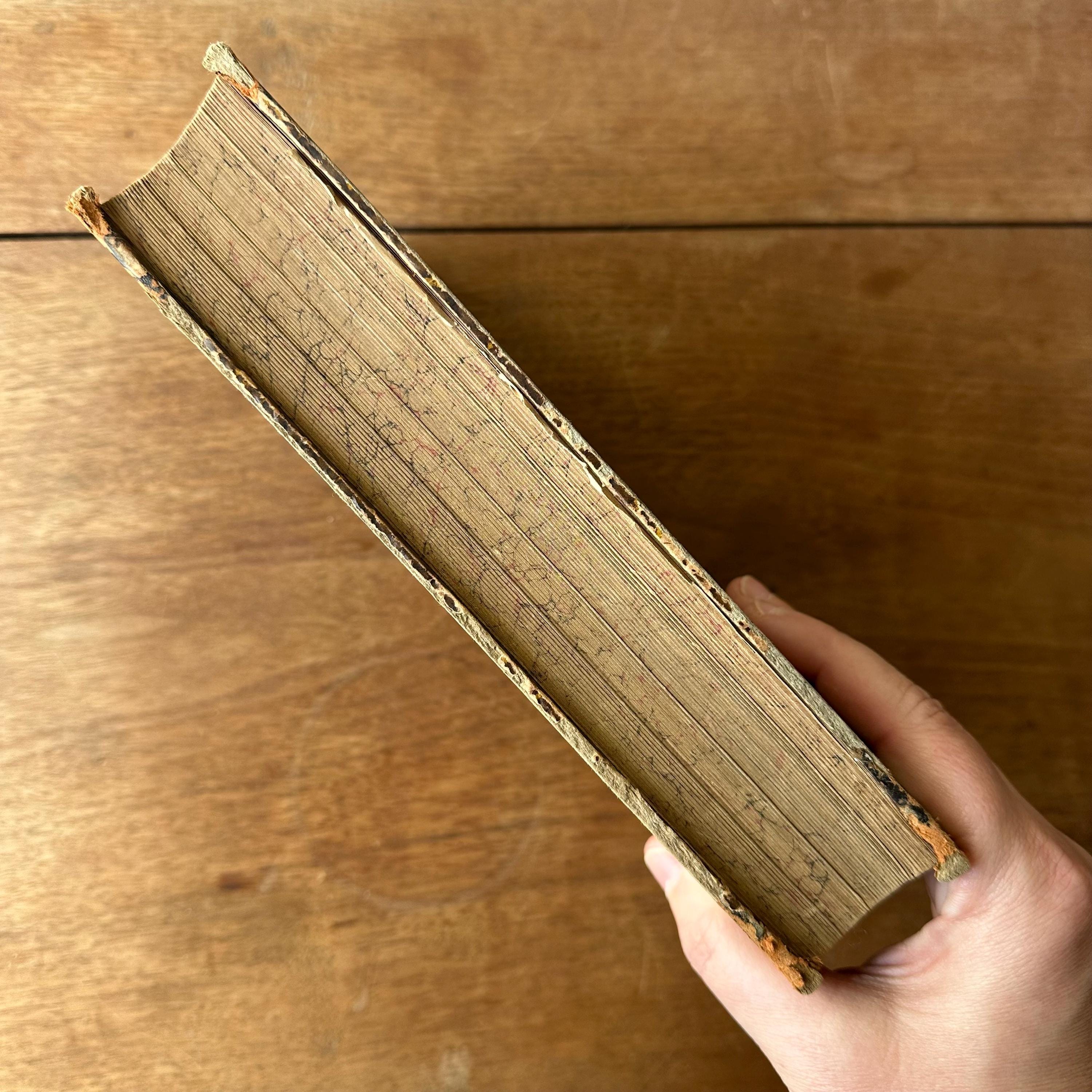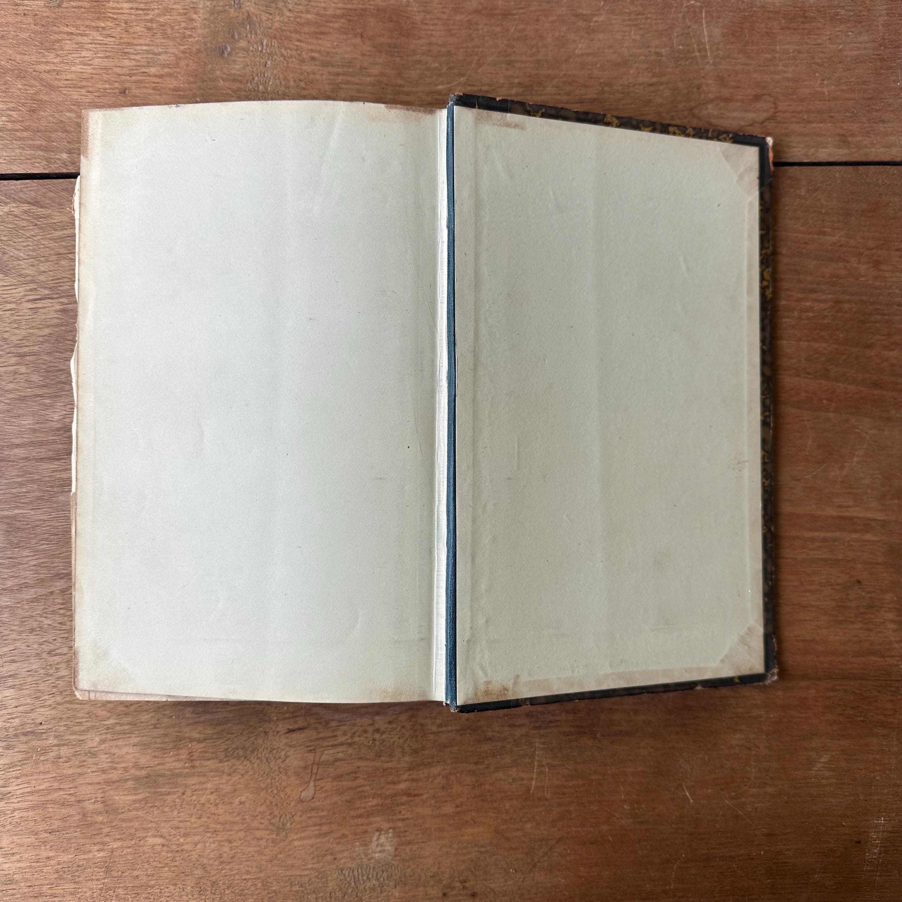 The book is in good antique condition for its age and use. It has general wear to the covers with concentrated wear to the corners and edges. The spine's gold lettering is intact and there are multiple scratches to the leather. The covers are attached at the spine. The pages are yellowed. The fold out pages have some small tears to the edges.