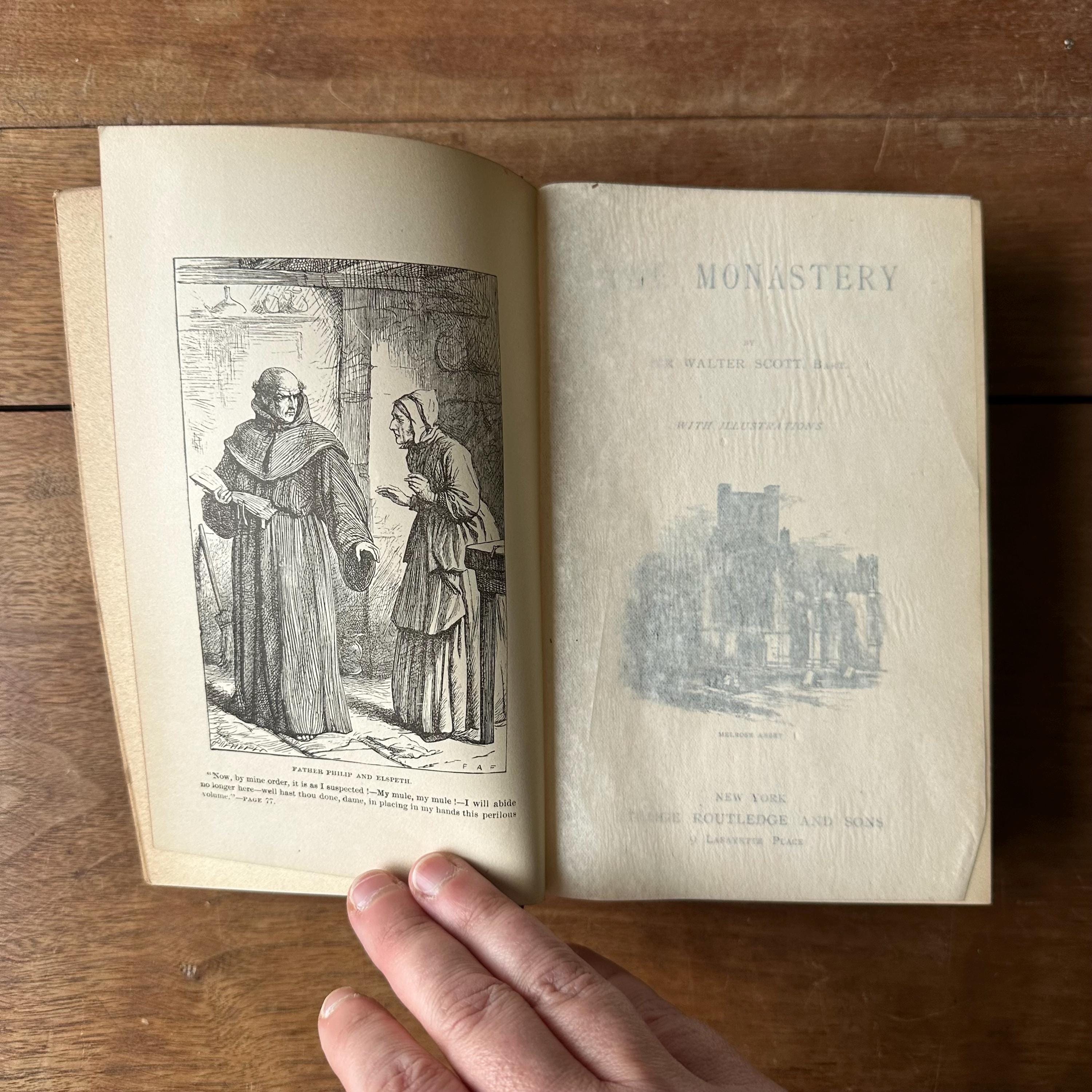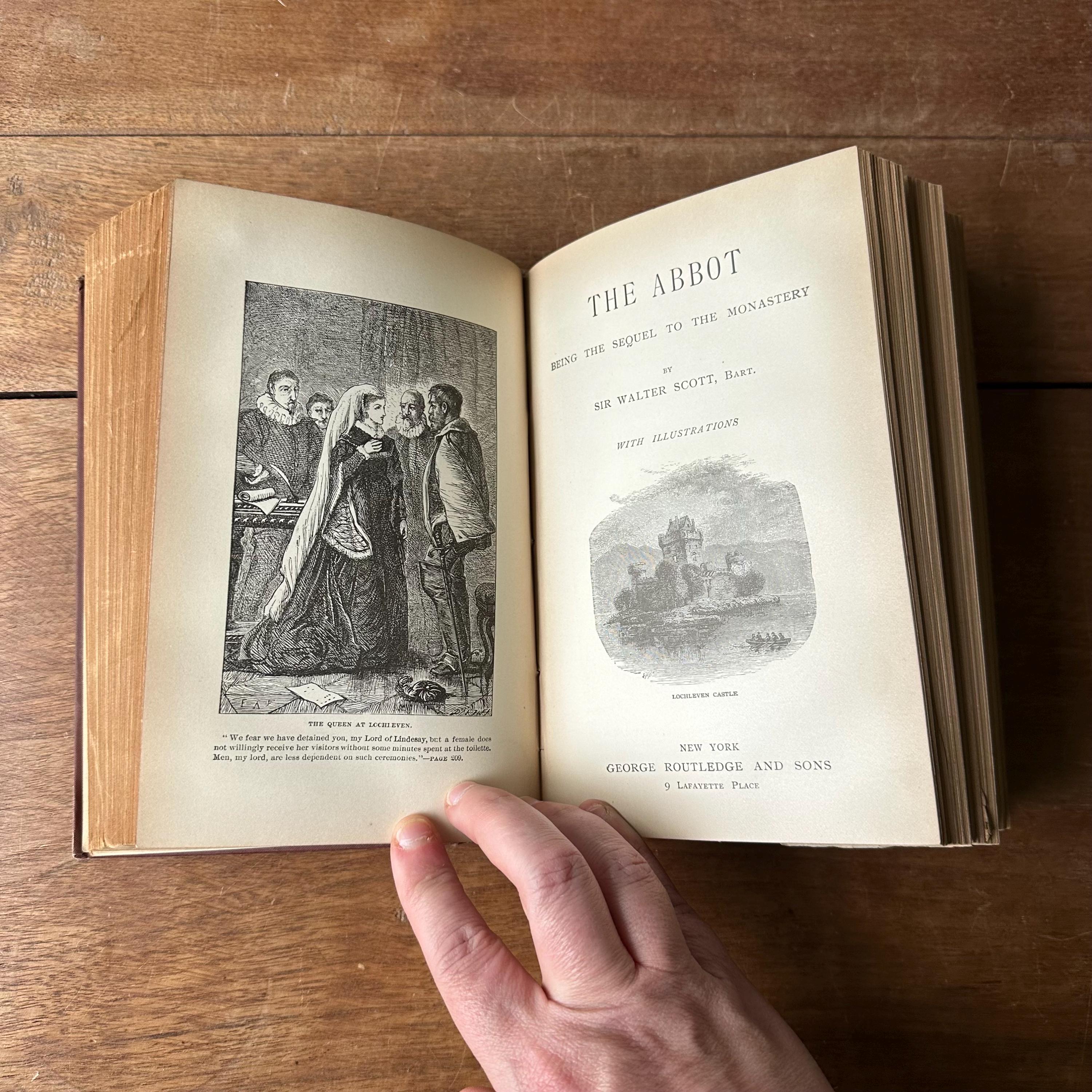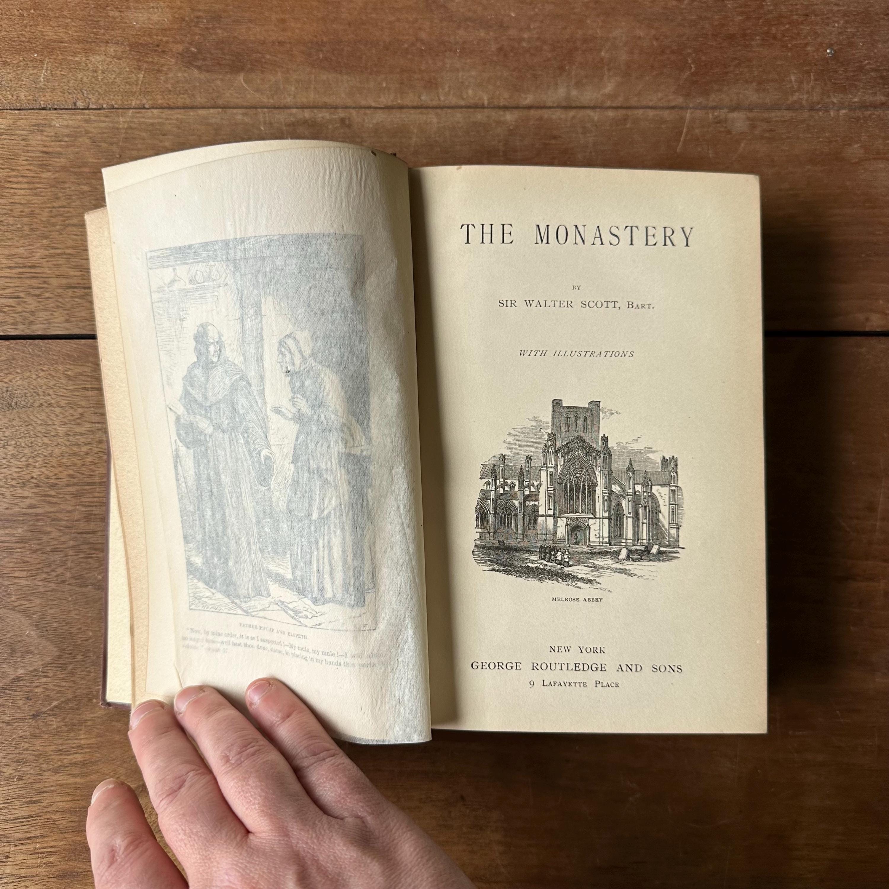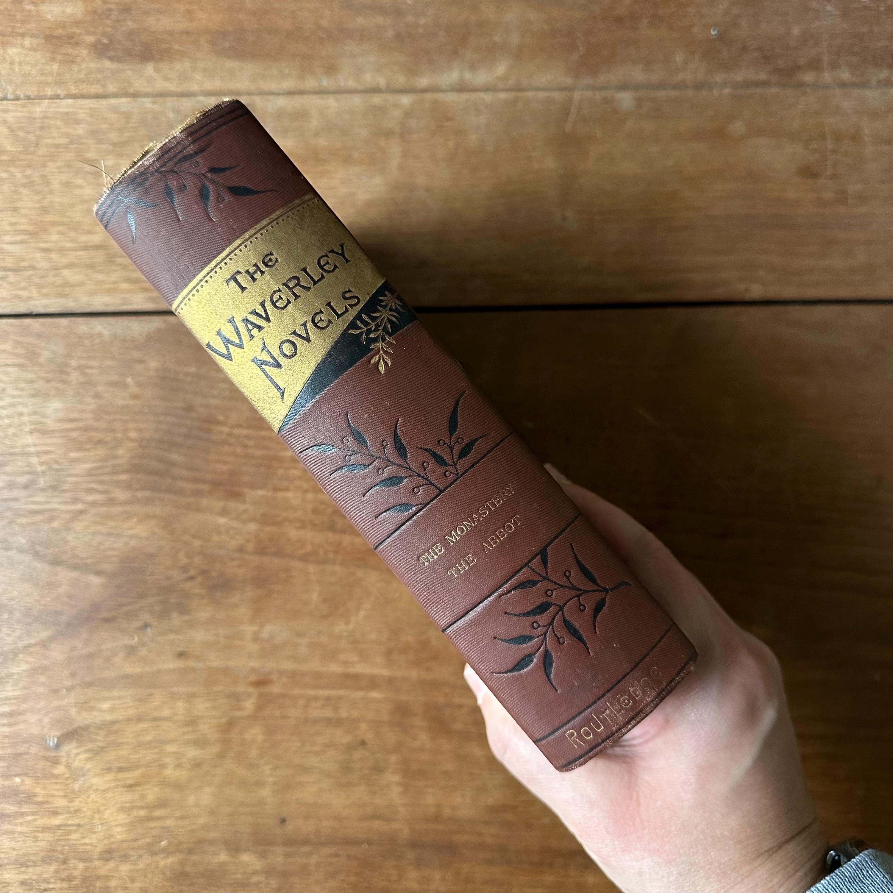 This is the antique Kenilworth Edition of Sir Walter Scott's Waverly Novels, published by George Routledge and Sons between 1881 and 1886. The book is actually two novels in one - The Monastery and The Abbott. This edition has brown covers with black botanical details and gold lettering and details on the spine. The back is embossed with Scott's monogram and more botanical details. The front and back endpapers are dark green. The book is illustrated for both novels with black and white illustration plates. The novels are paged separately, and there are several advertisement pages at the very end.