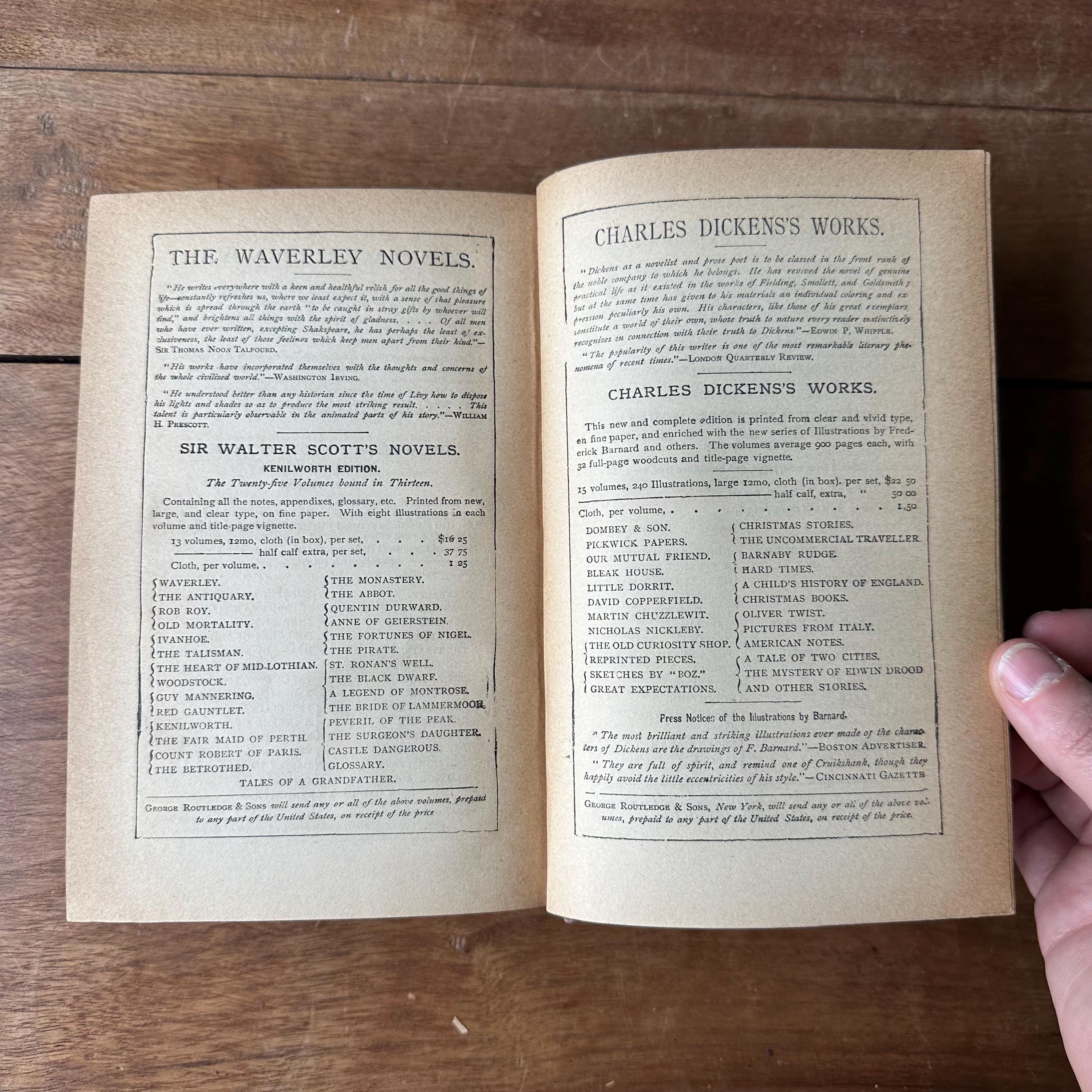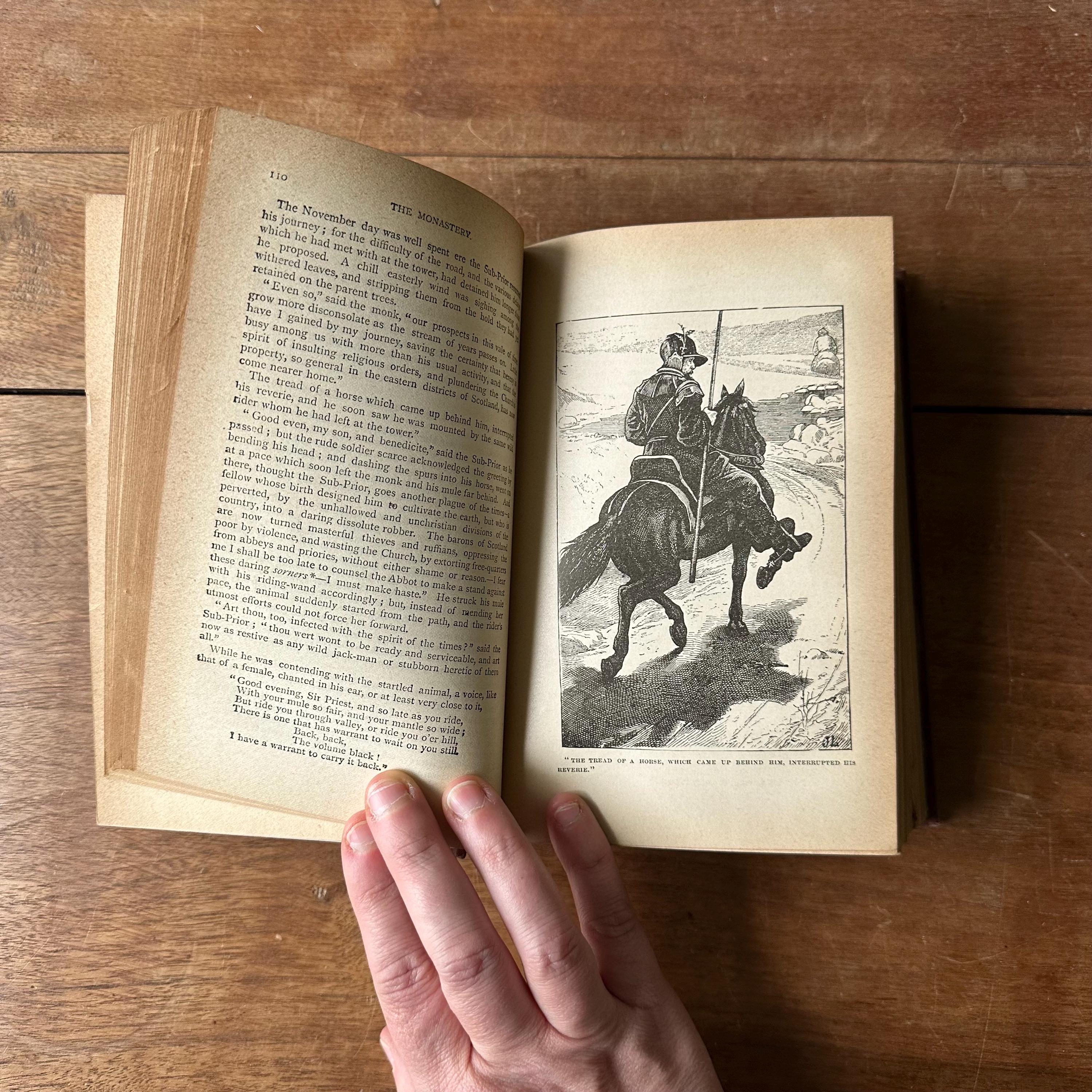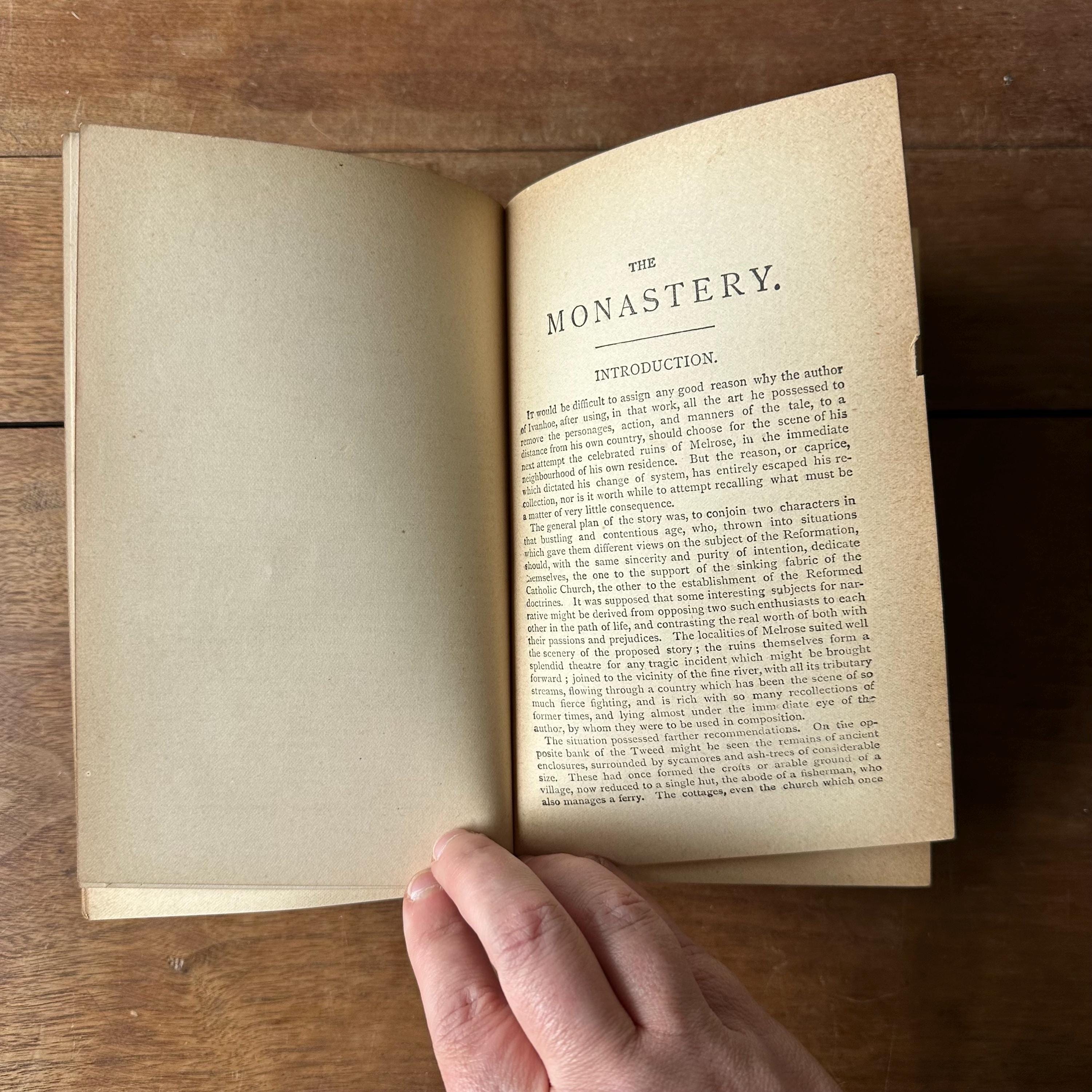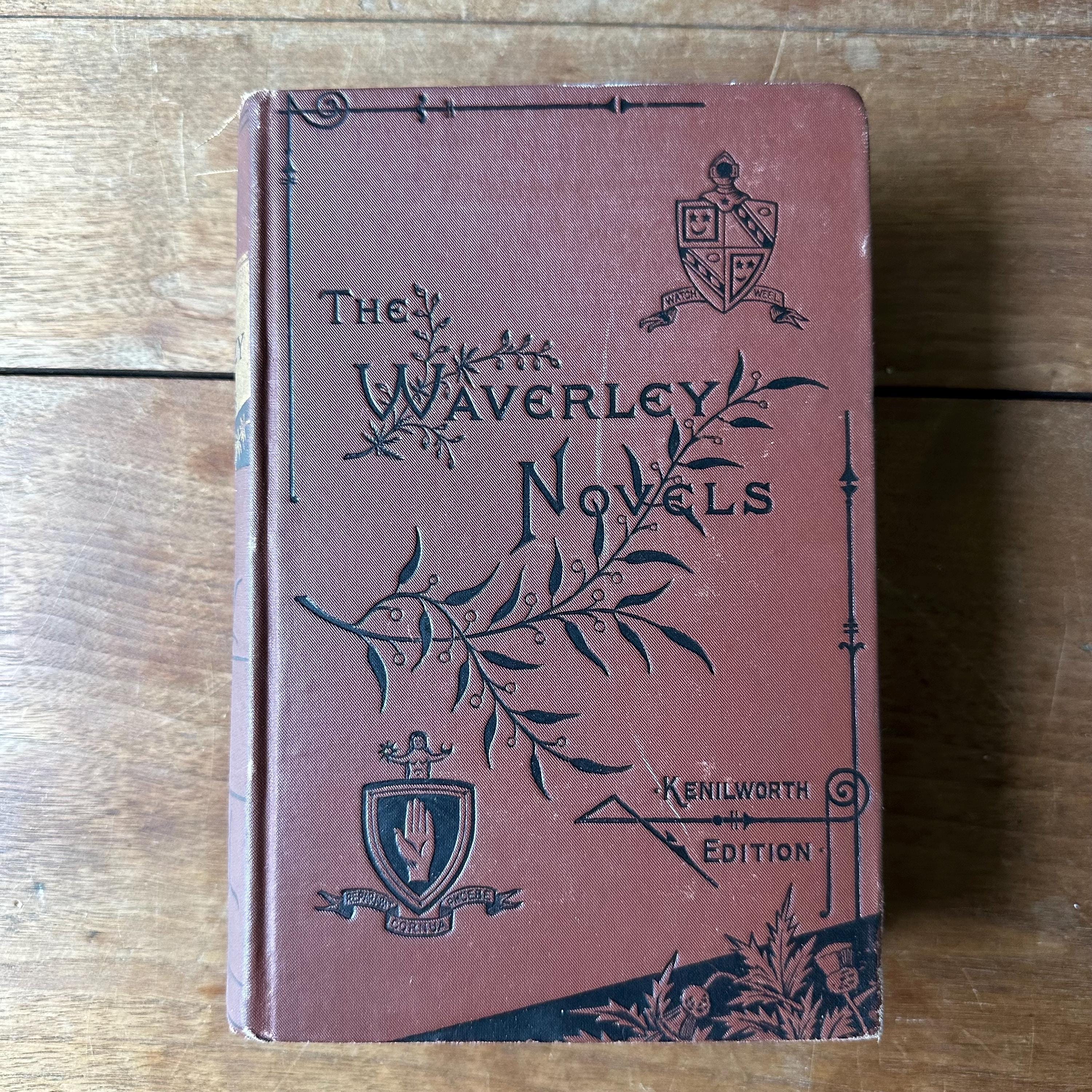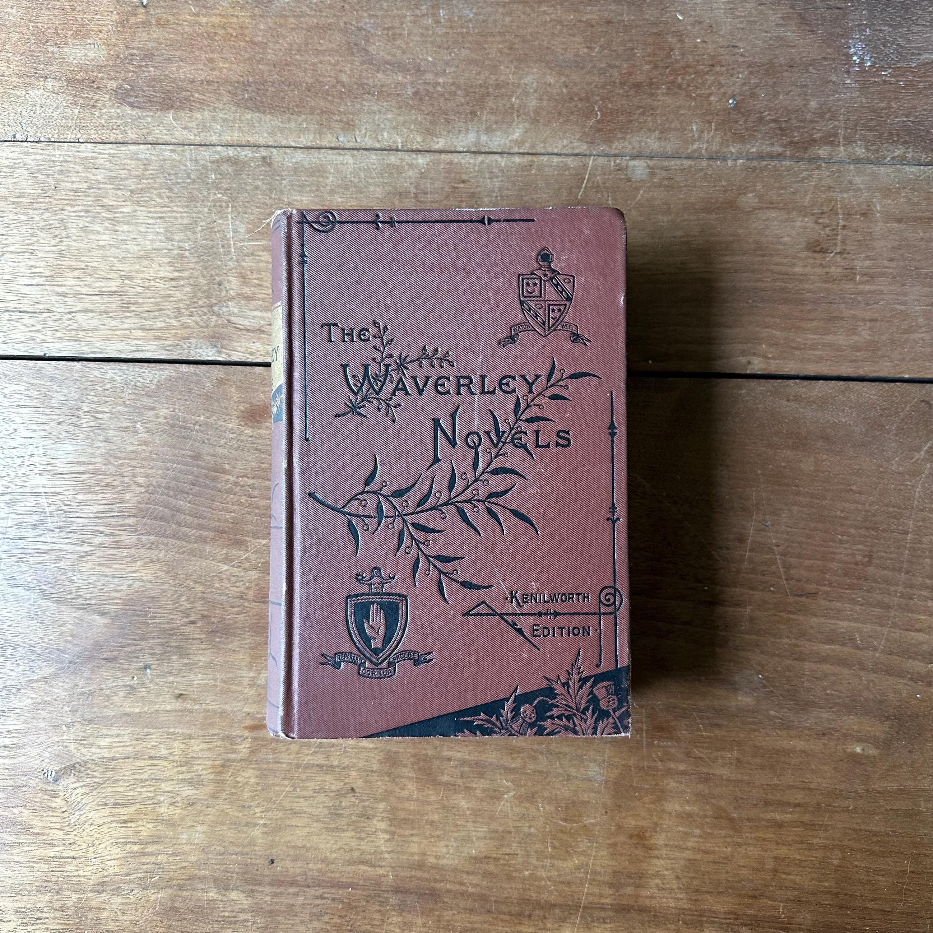 This is the antique Kenilworth Edition of Sir Walter Scott's Waverly Novels, published by George Routledge and Sons between 1881 and 1886. The book is actually two novels in one - The Monastery and The Abbott. This edition has brown covers with black botanical details and gold lettering and details on the spine. The back is embossed with Scott's monogram and more botanical details. The front and back endpapers are dark green. The book is illustrated for both novels with black and white illustration plates. The novels are paged separately, and there are several advertisement pages at the very end.