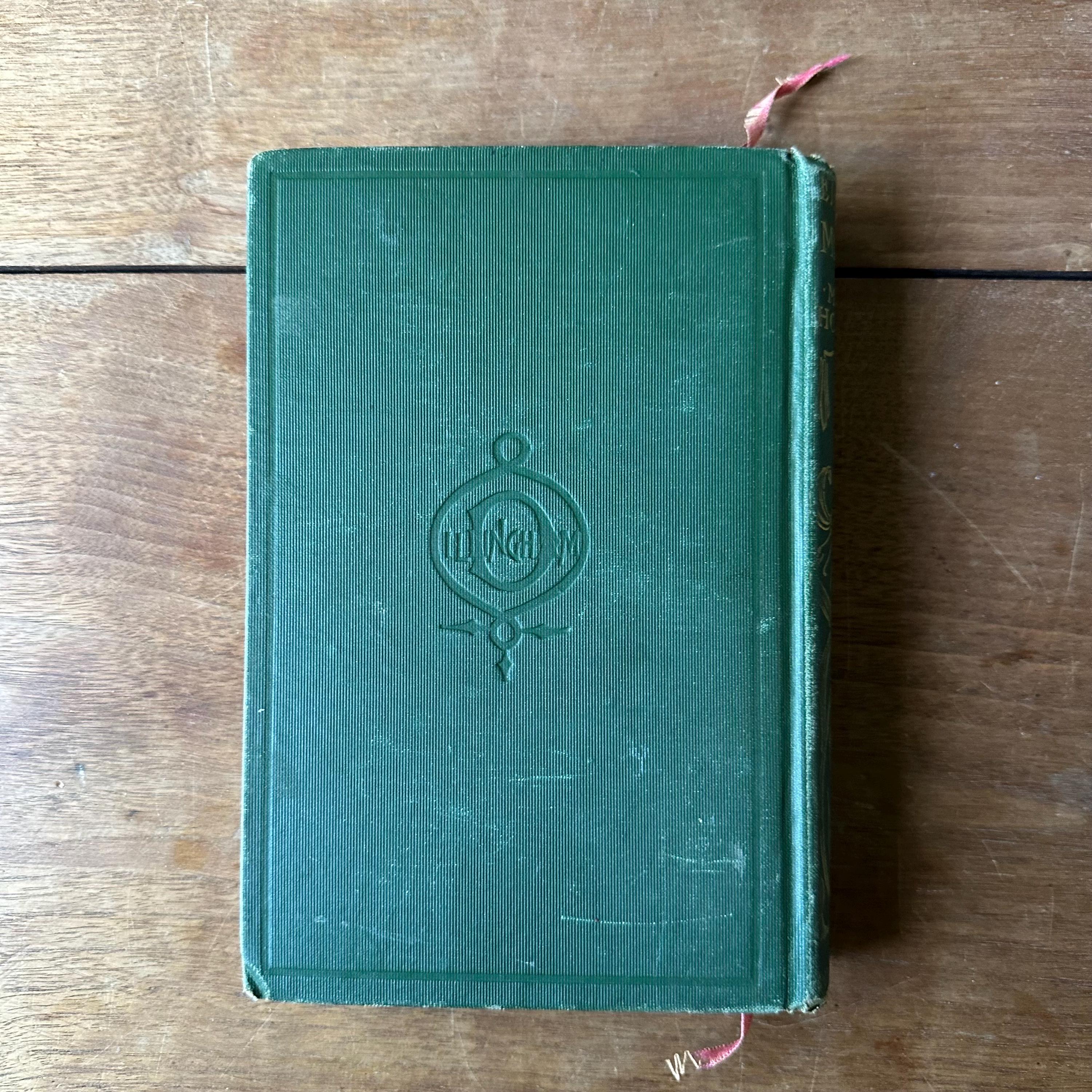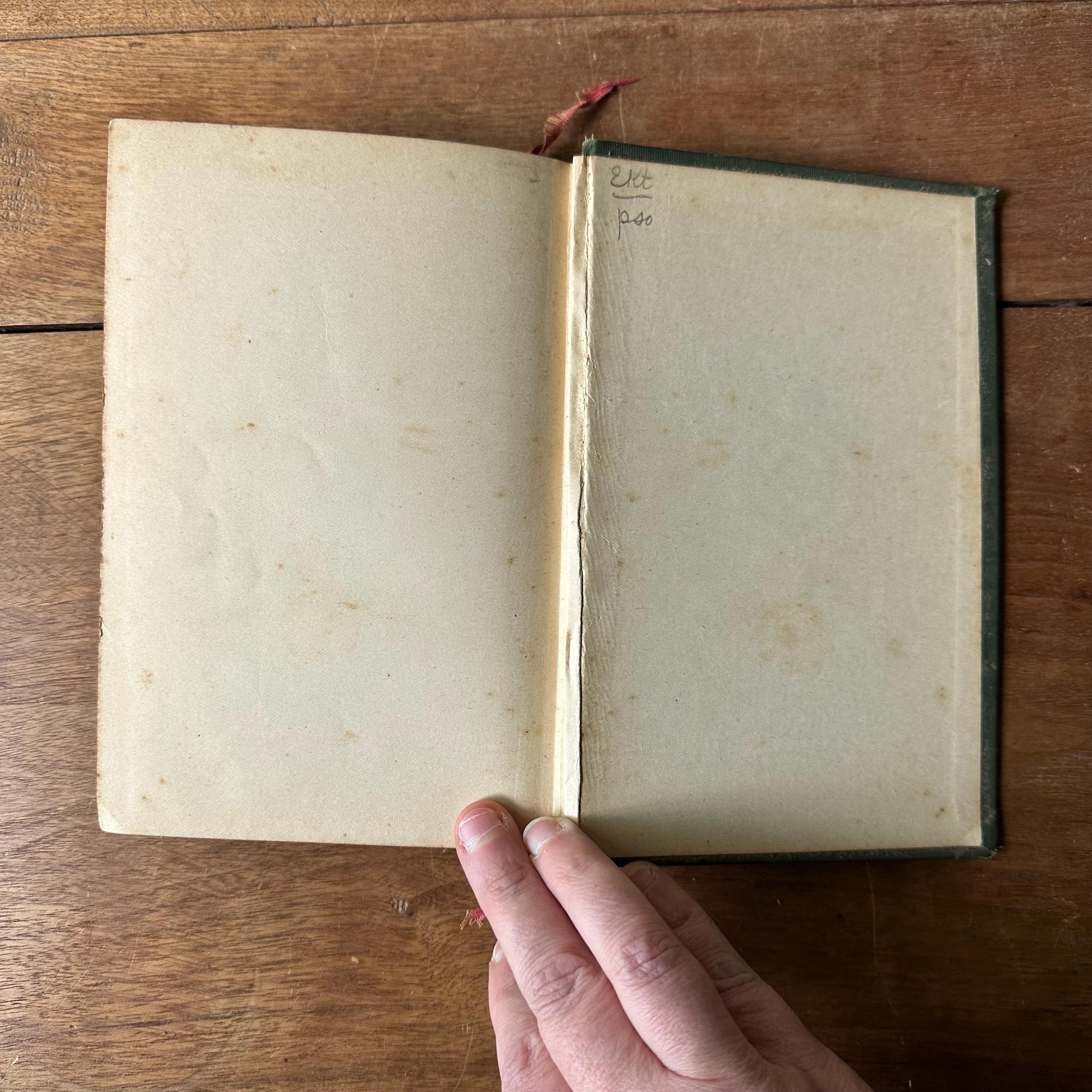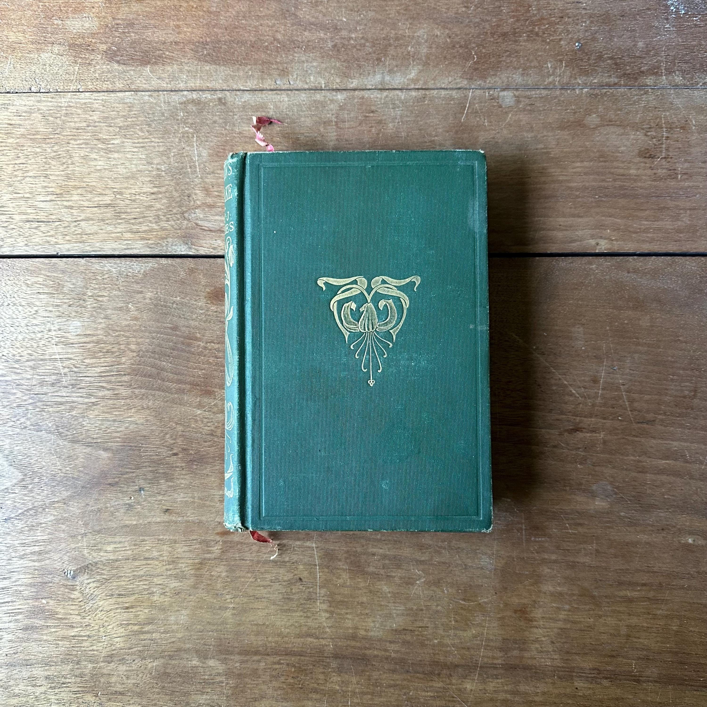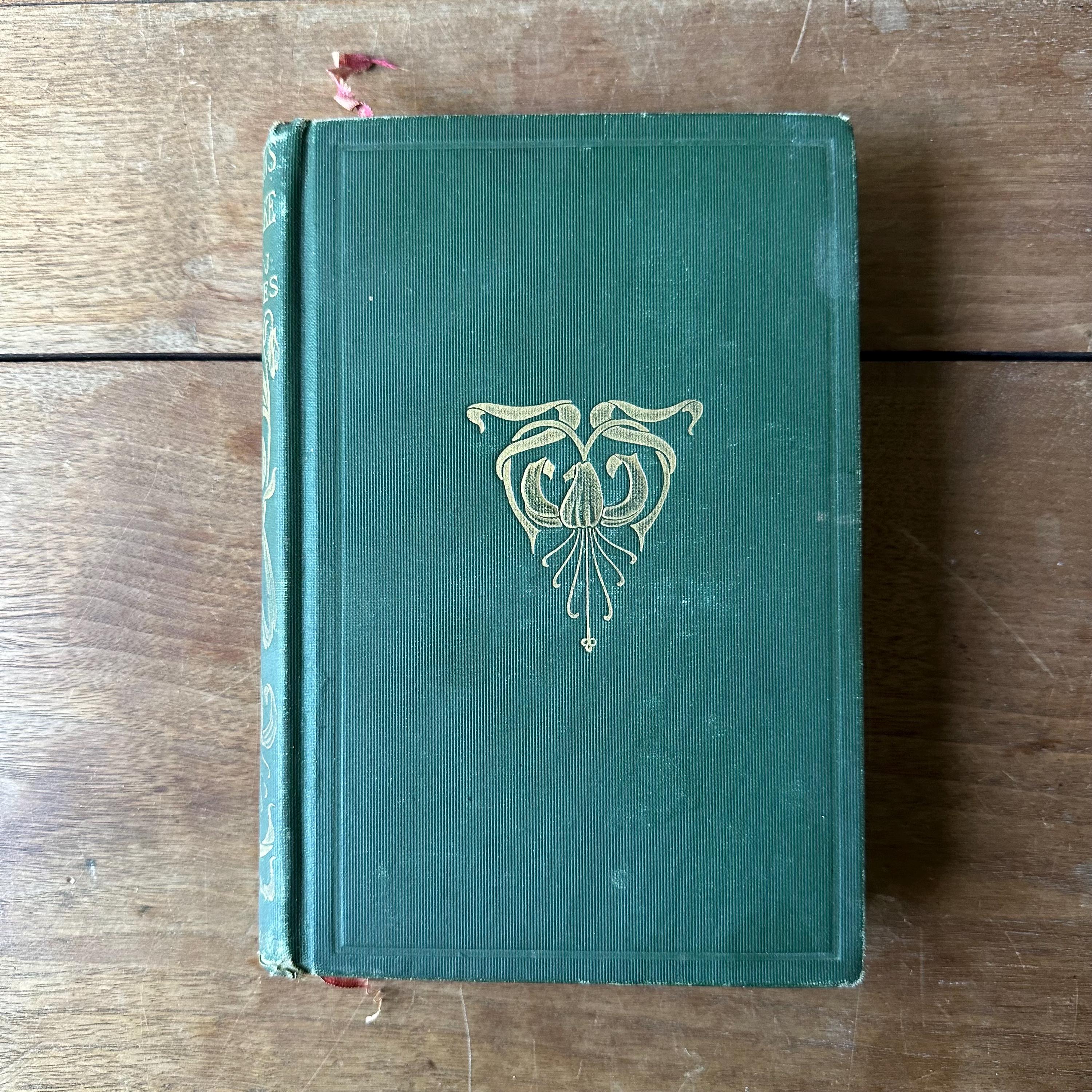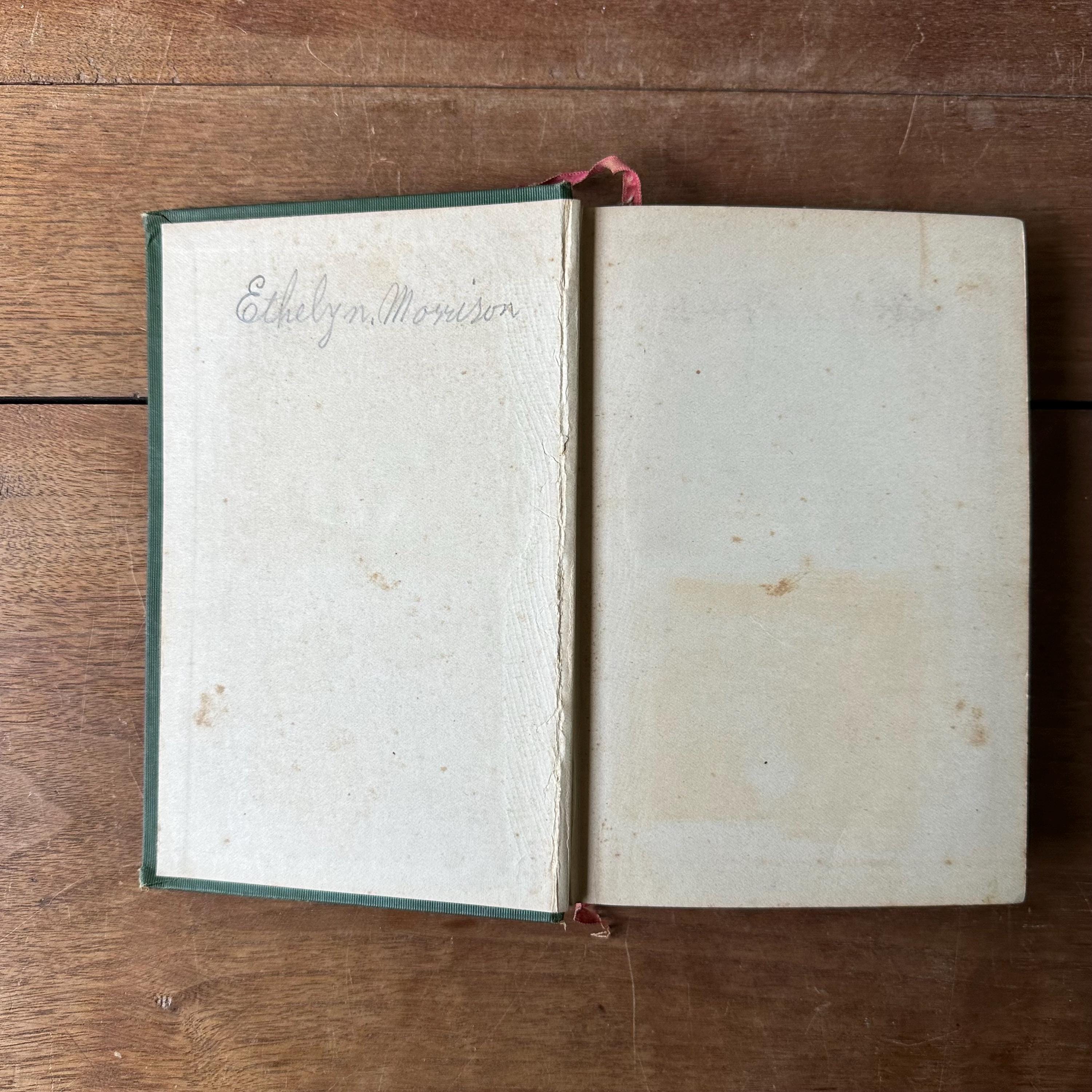 The book is in good antique condition for its age and use. The covers have general wear with fraying to corners and spine edges. The gold is intact with some slight fading. The covers are attached at the spine, Ethelyn Morrison wrote her name in pencil inside the front cover. The pages are browning. There is a four leaf clover pressed between the pages.