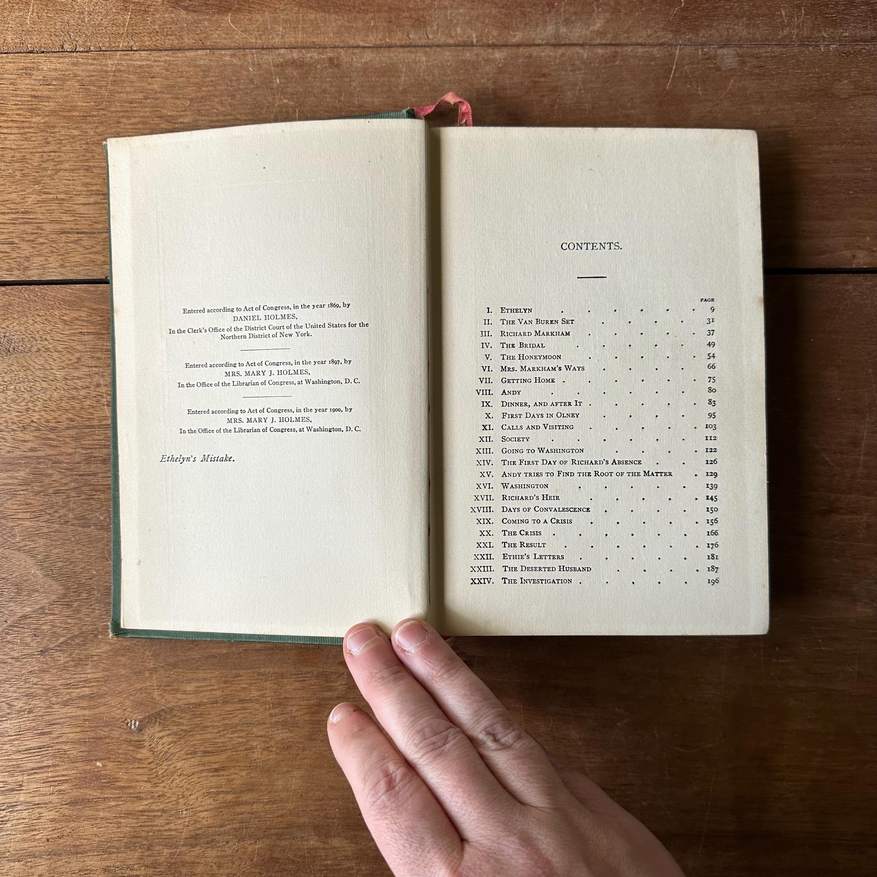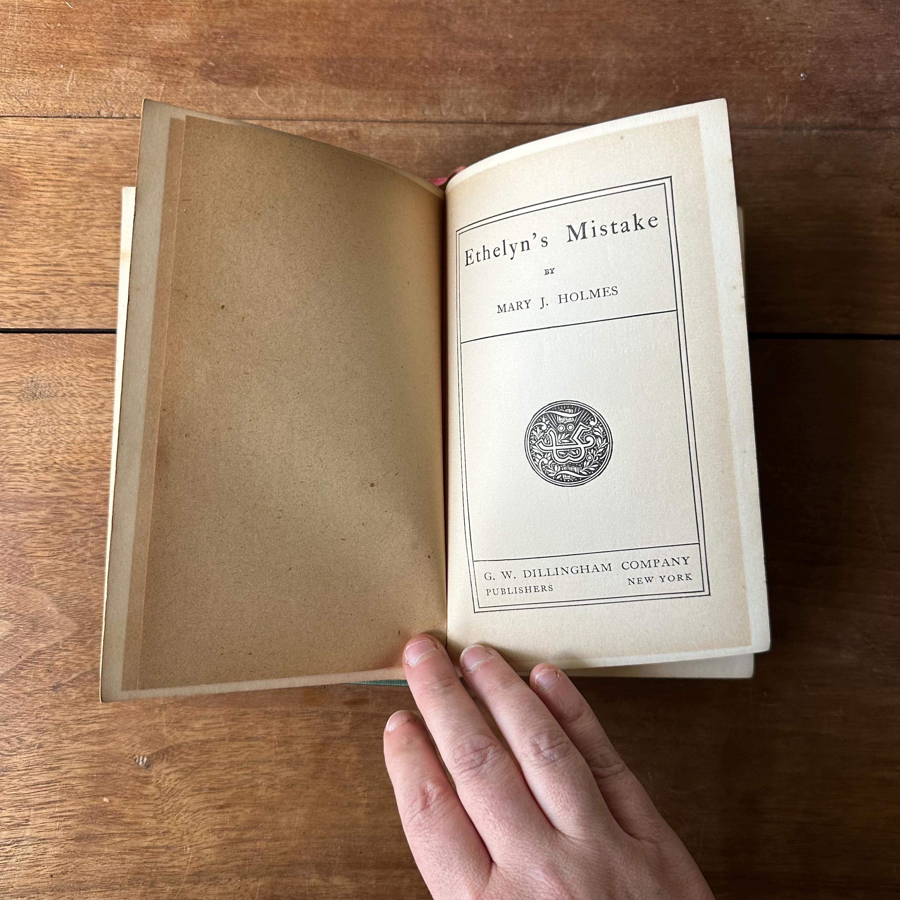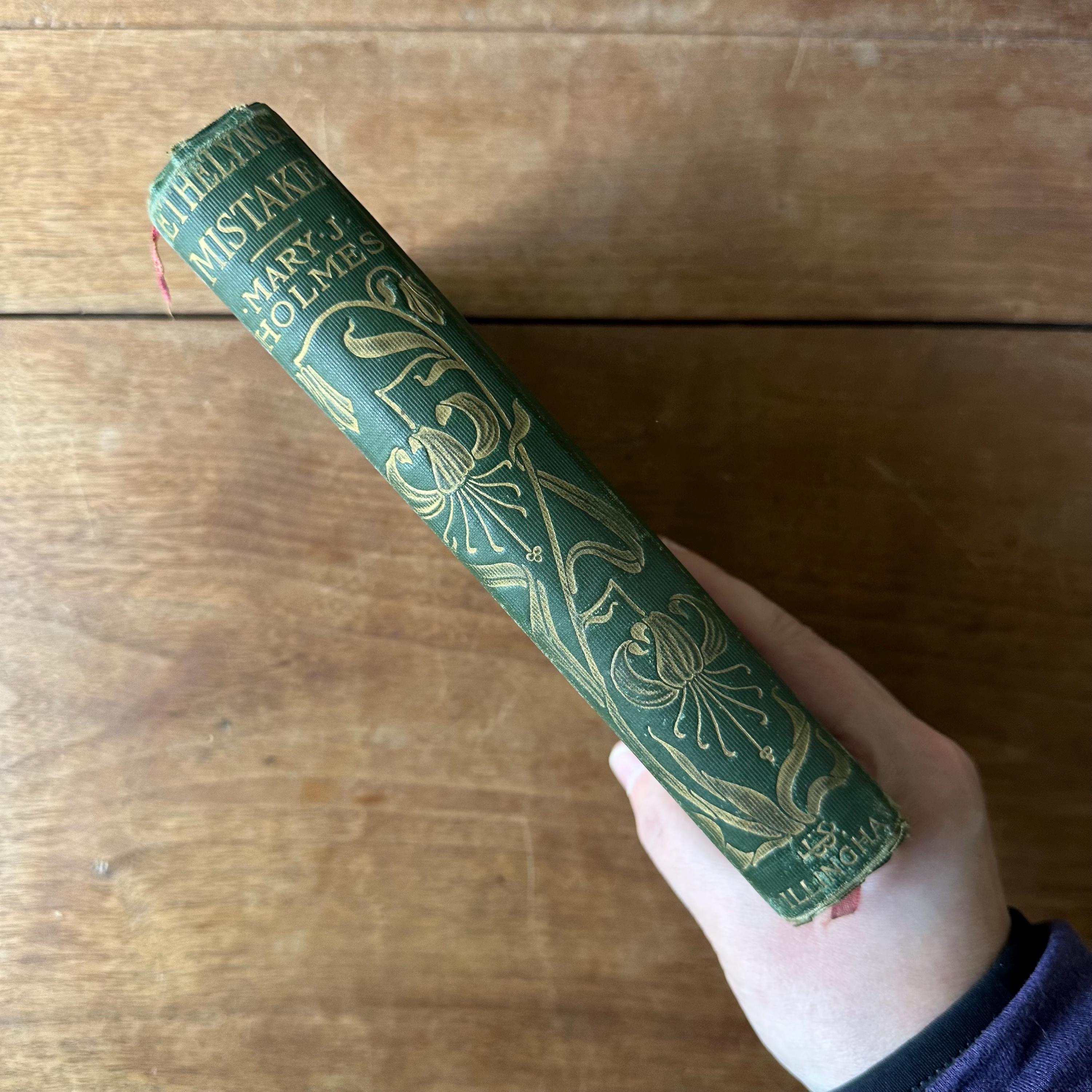 This is the 1900 third edition of Ethelyn's Mistake by Mary J. Holmes, published by G.W. Dillingham and Company. It has dark green covers with lovely gold floral illustrations on the cover and spine. The spine is also lettered in gold. There is one black and white illustration plate at the title page. There are 303 pages with a red ribbon bookmark.