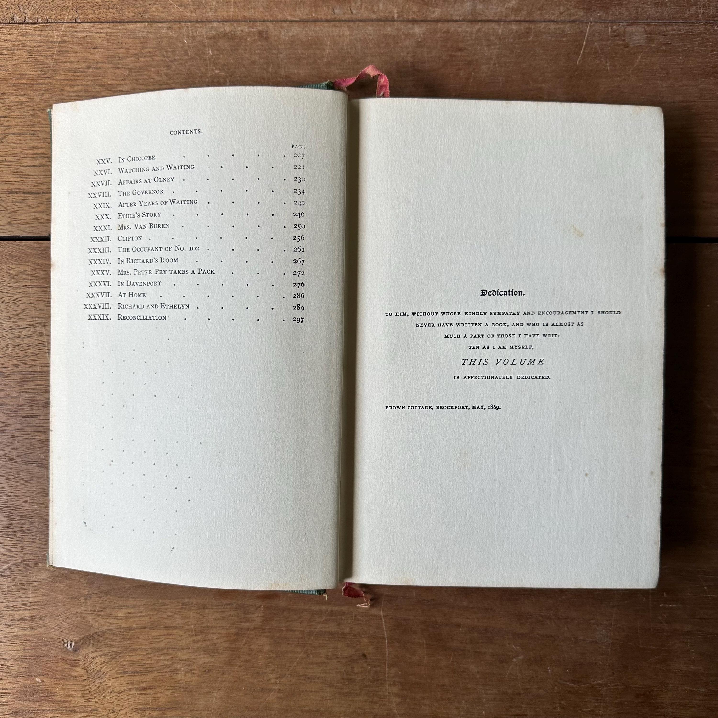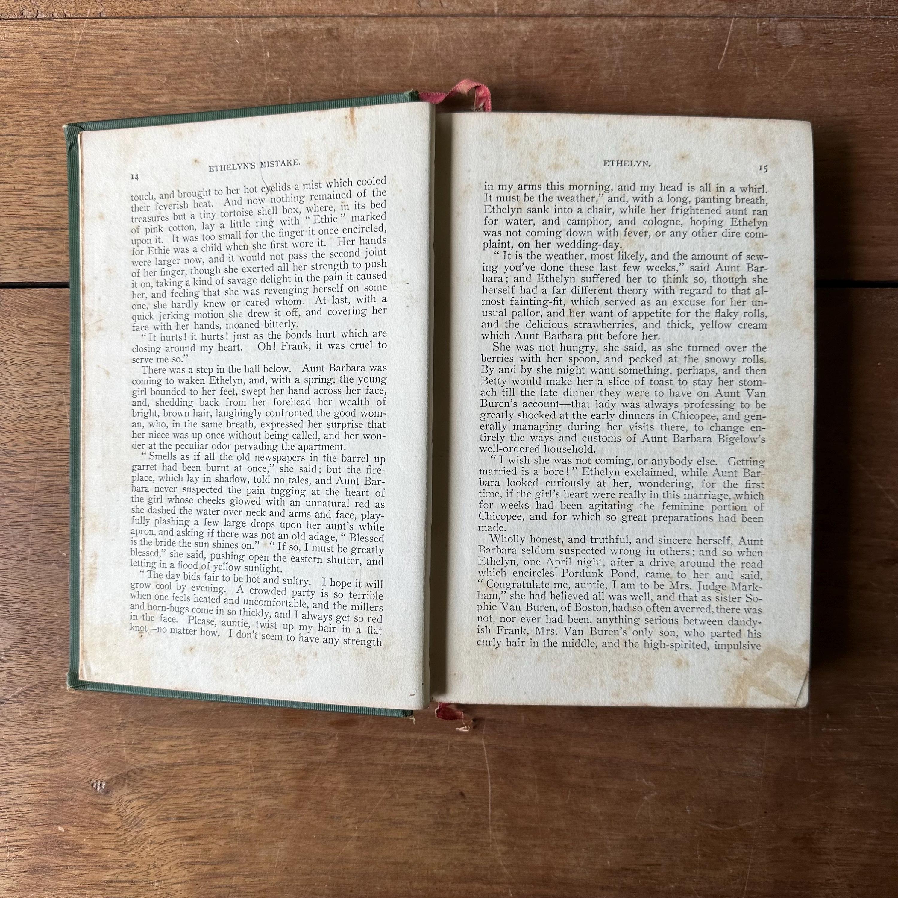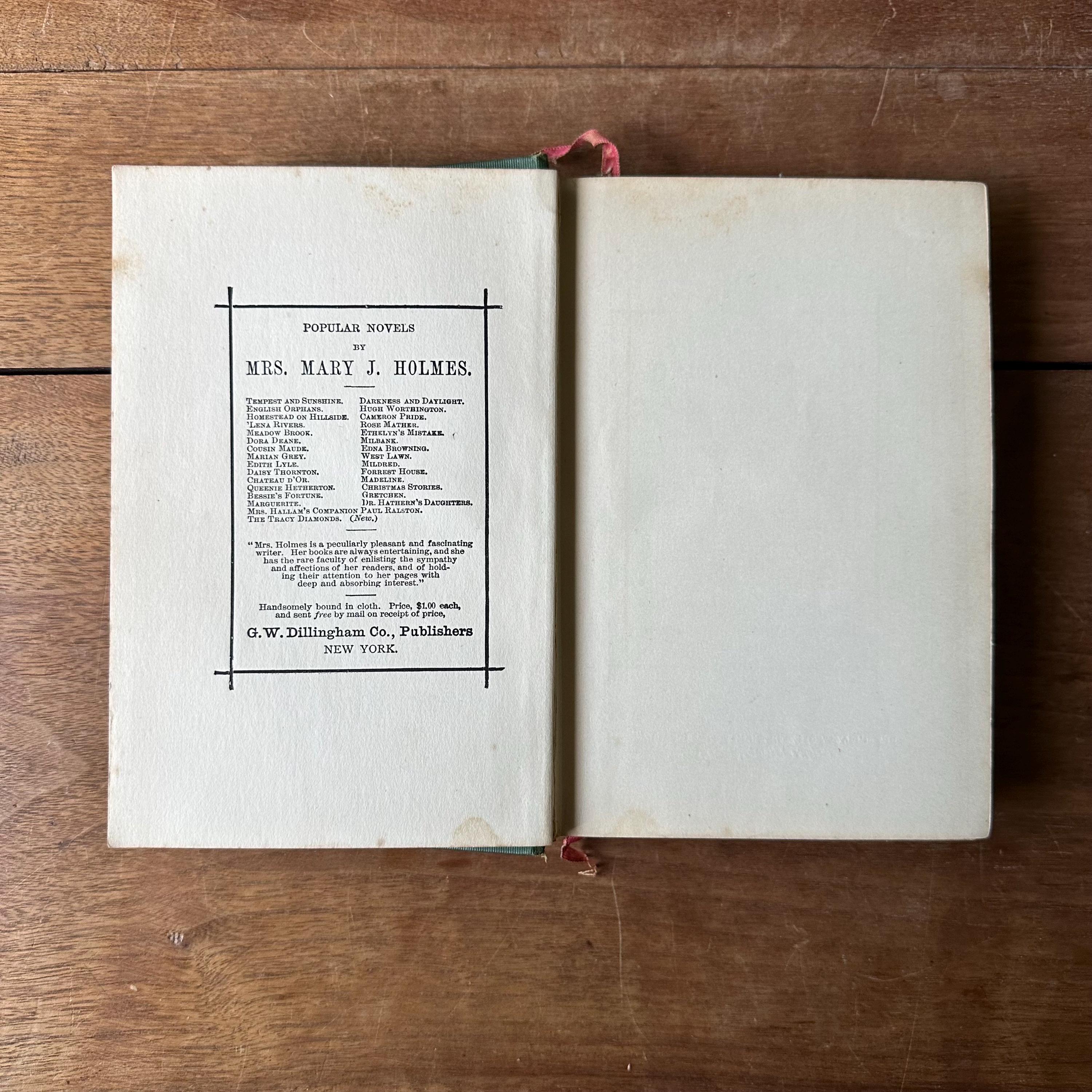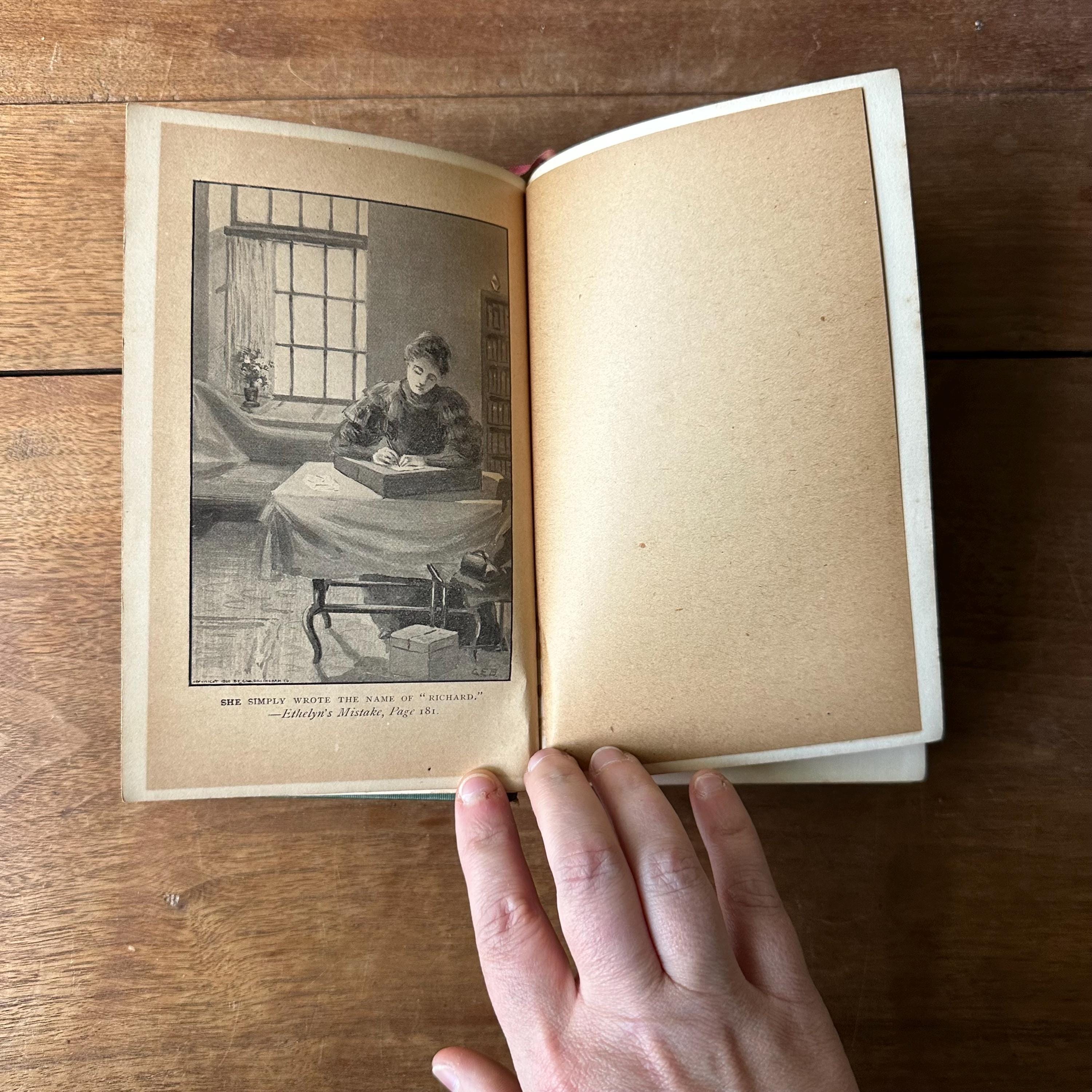 This is the 1900 third edition of Ethelyn's Mistake by Mary J. Holmes, published by G.W. Dillingham and Company. It has dark green covers with lovely gold floral illustrations on the cover and spine. The spine is also lettered in gold. There is one black and white illustration plate at the title page. There are 303 pages with a red ribbon bookmark.