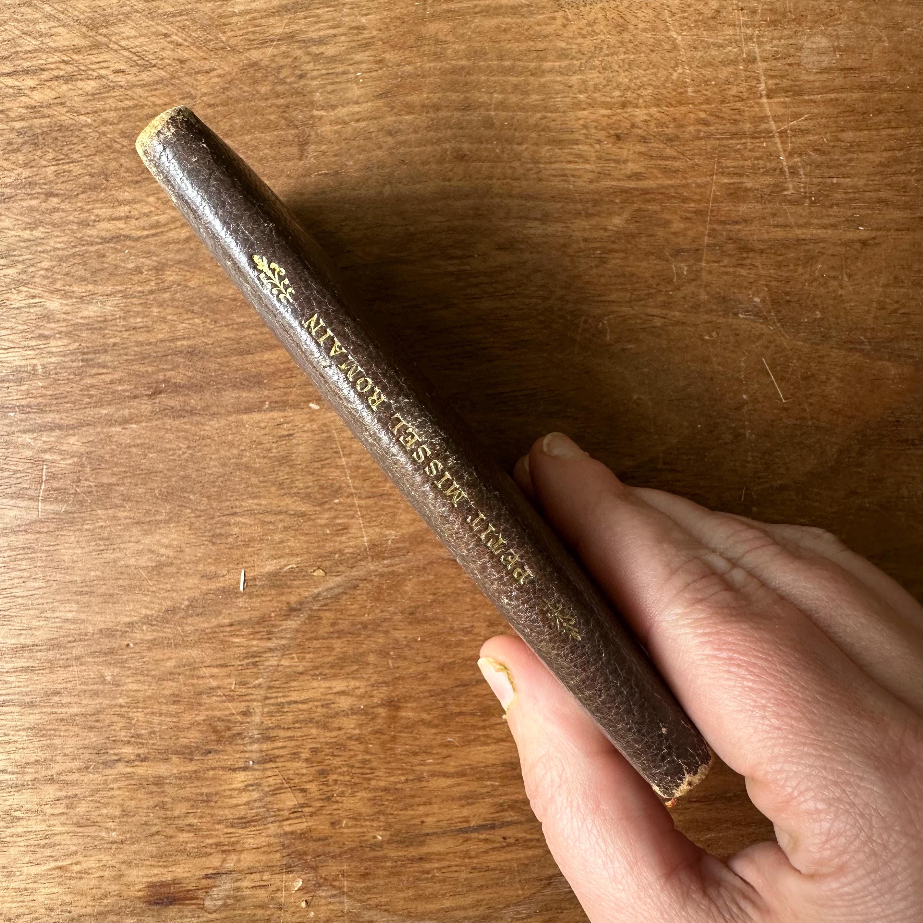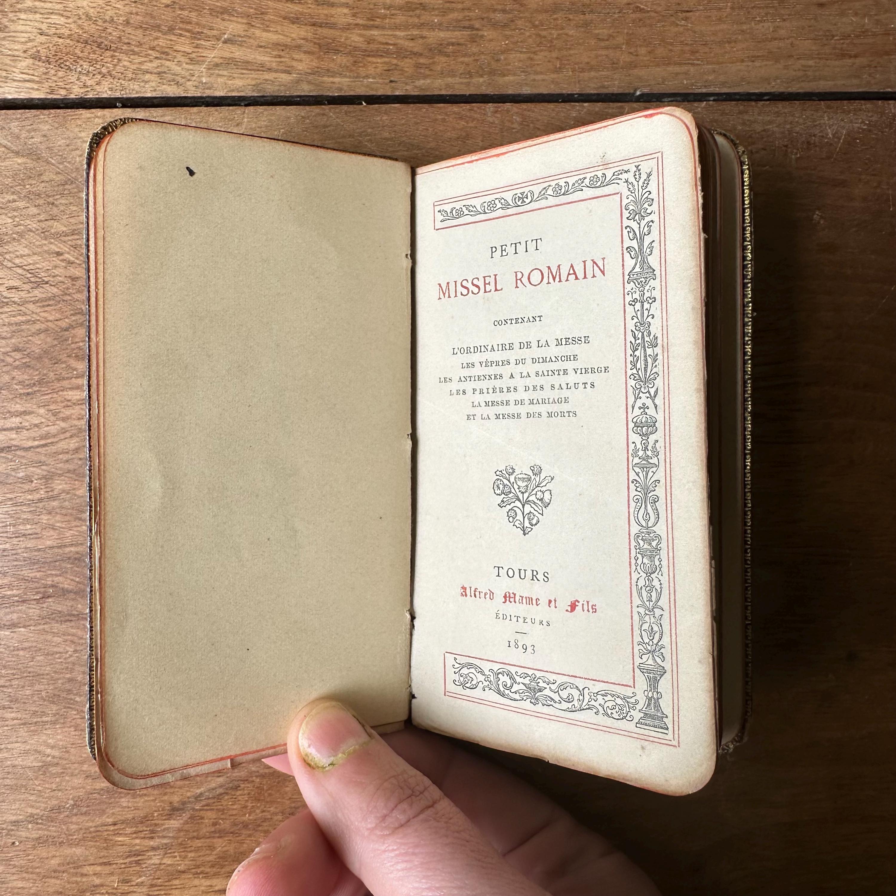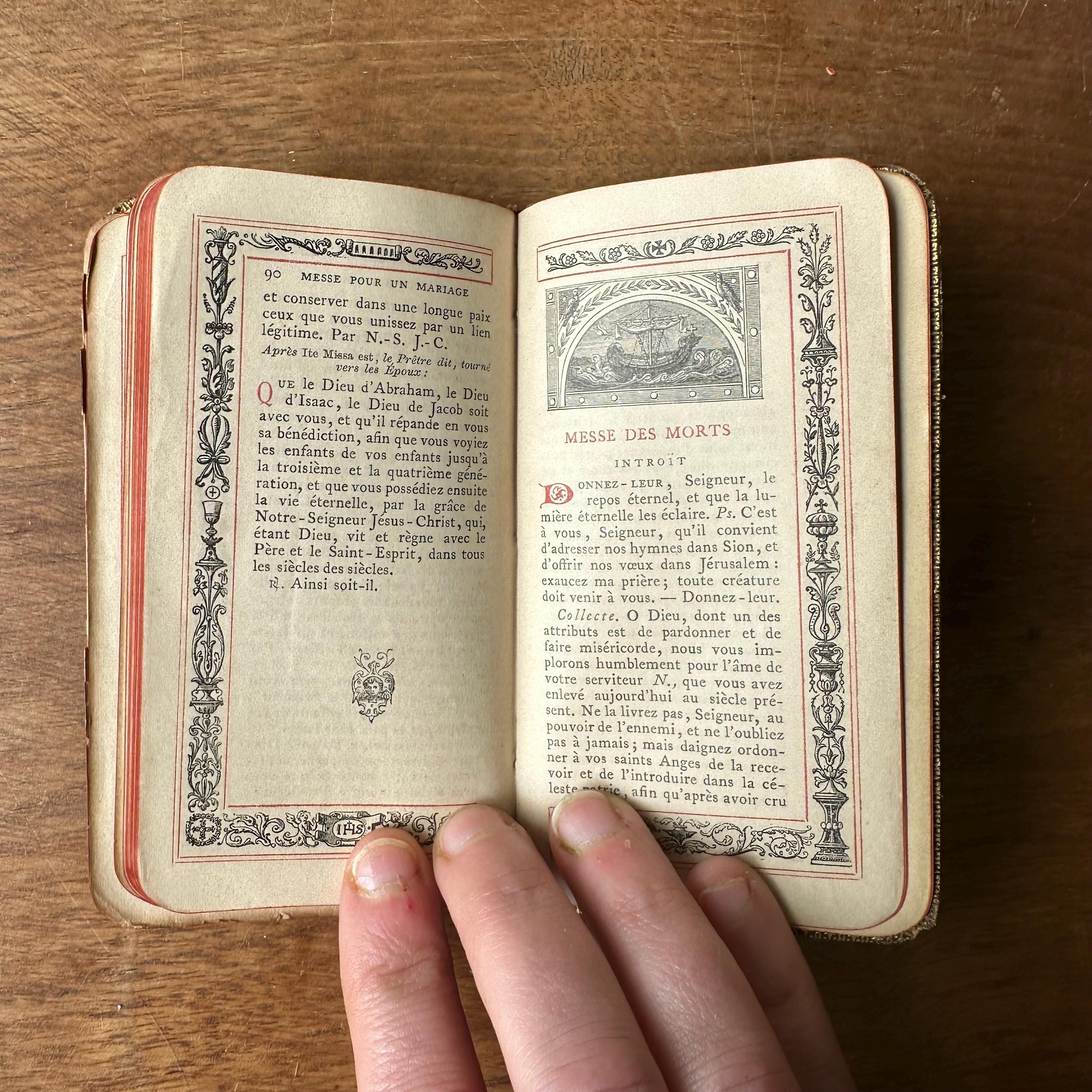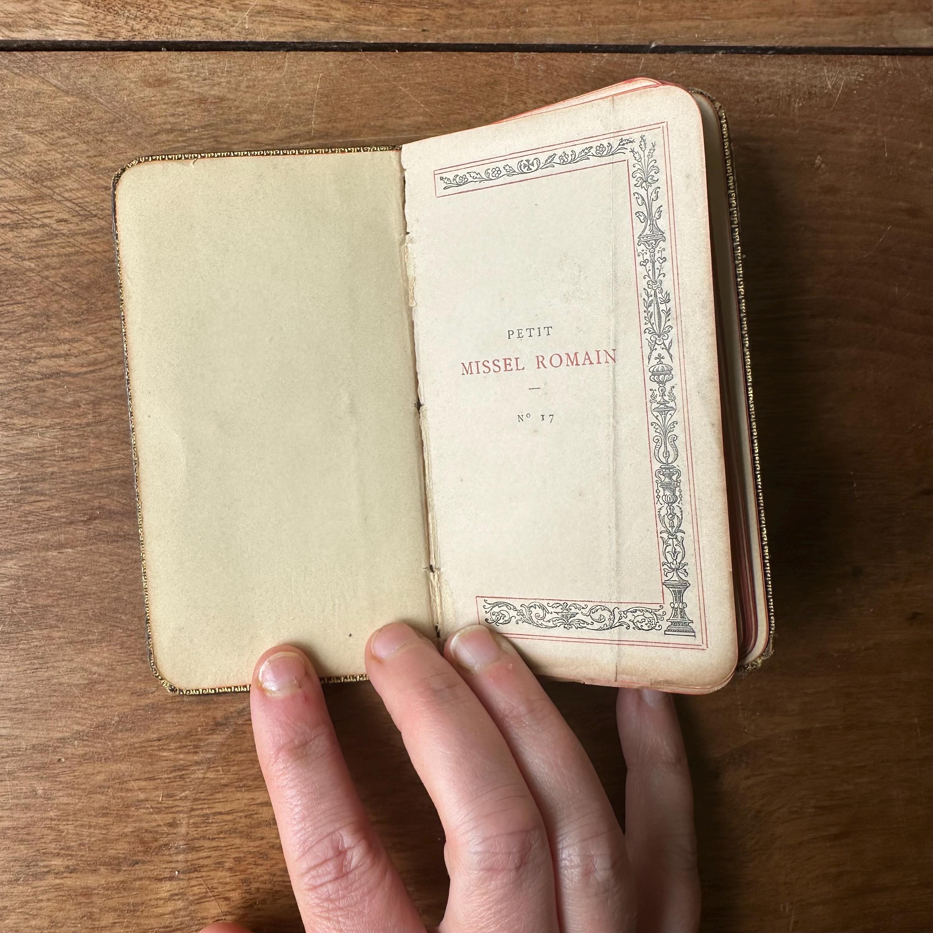 This is an antique, miniature, French language Petit Missel Romain No. 17, published in Tours by Alfred Mame et Fils. It is brown leather with gold lettering on the cover and spine. The endpapers are gorgeous gold medallions on black with gold tooling around the edge. There is one black and white illustration plate at the title page. Each page is also illustrated with a black and white floral illustrations in red border lines. There are 96 gilt-edge pages.