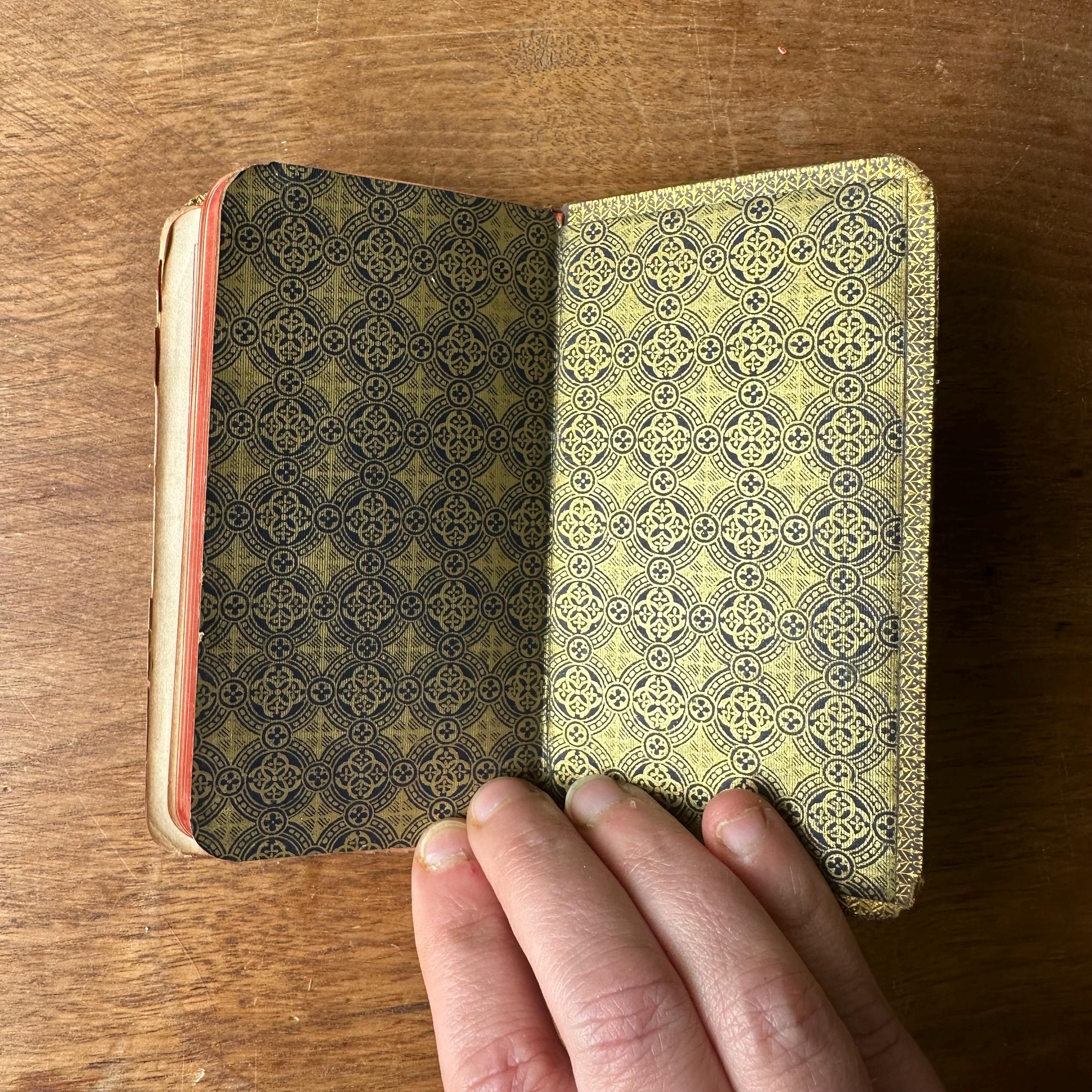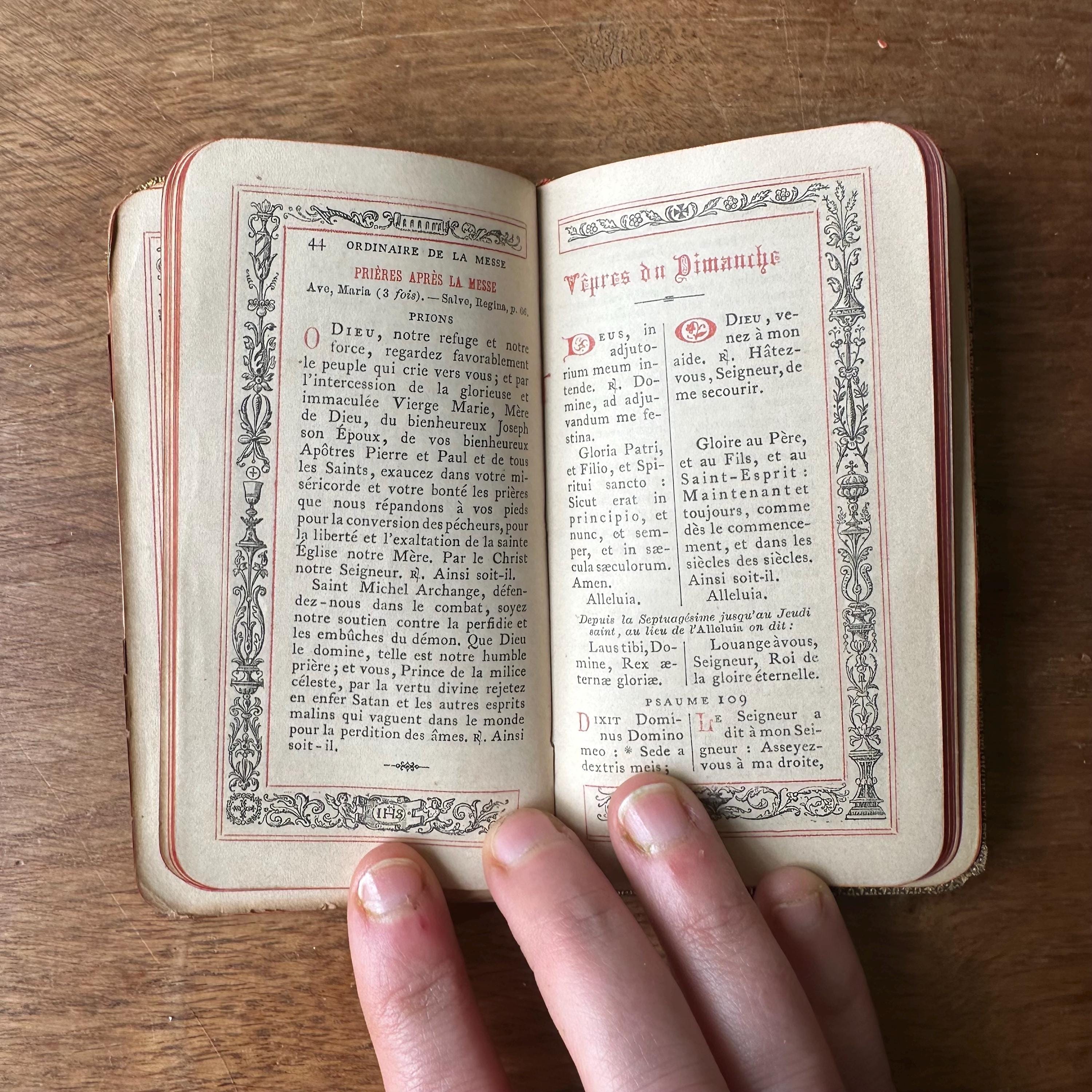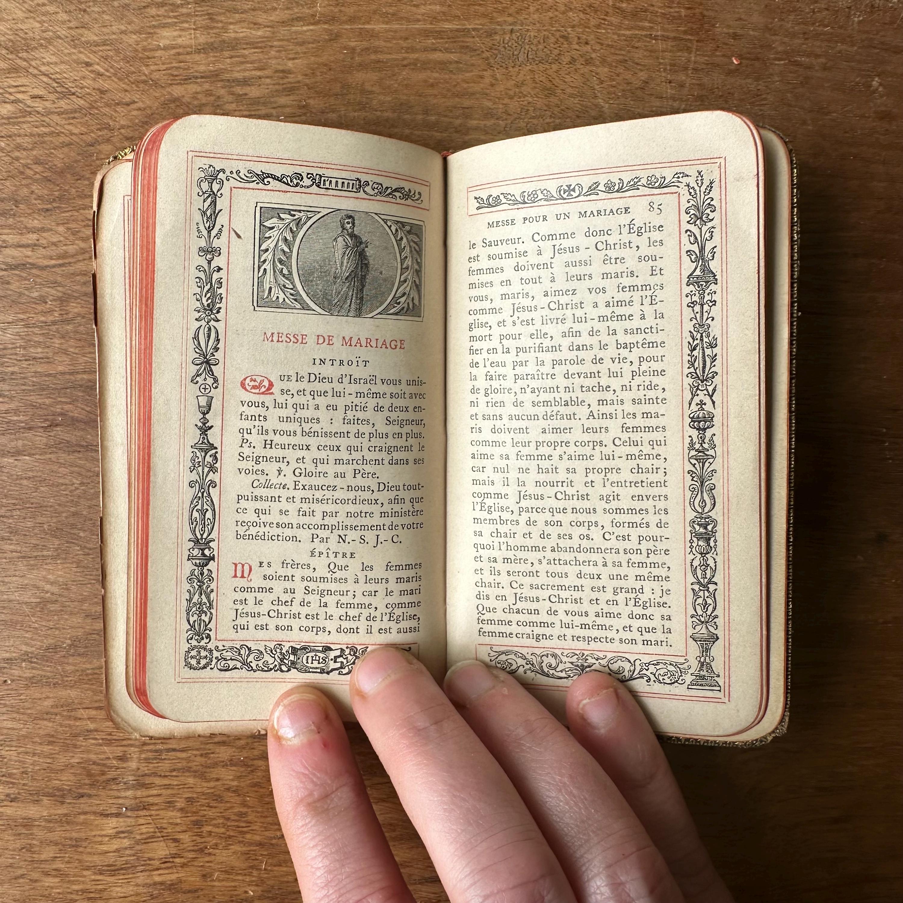 This is an antique, miniature, French language Petit Missel Romain No. 17, published in Tours by Alfred Mame et Fils. It is brown leather with gold lettering on the cover and spine. The endpapers are gorgeous gold medallions on black with gold tooling around the edge. There is one black and white illustration plate at the title page. Each page is also illustrated with a black and white floral illustrations in red border lines. There are 96 gilt-edge pages.