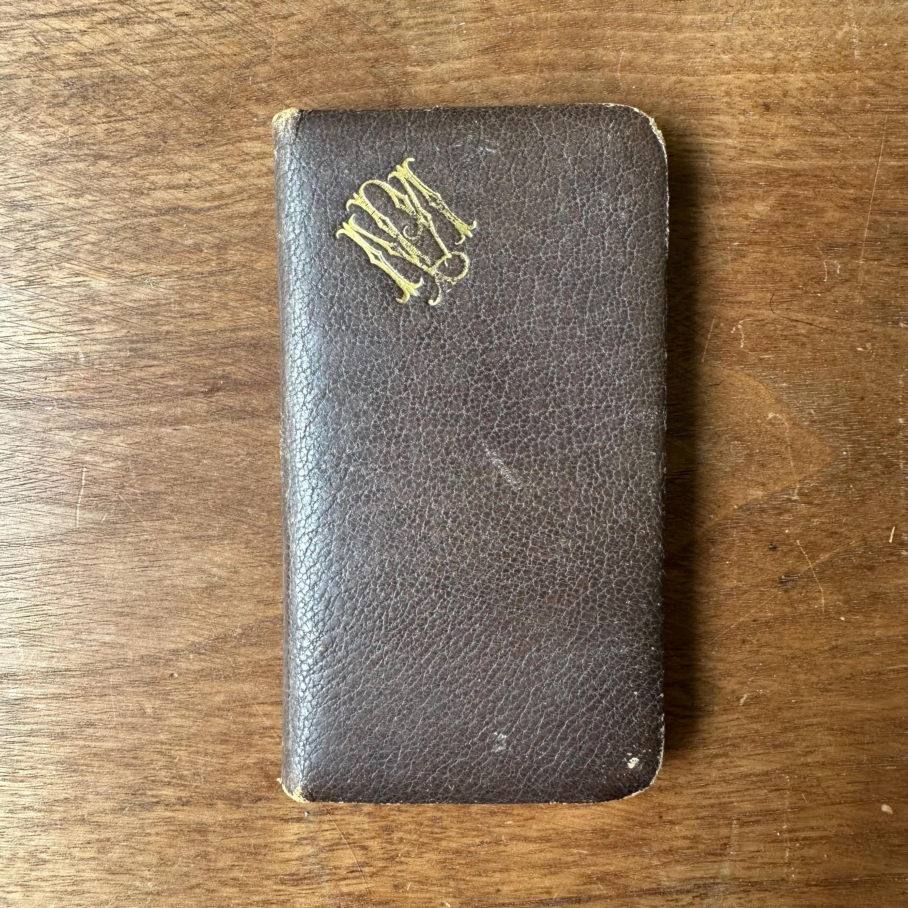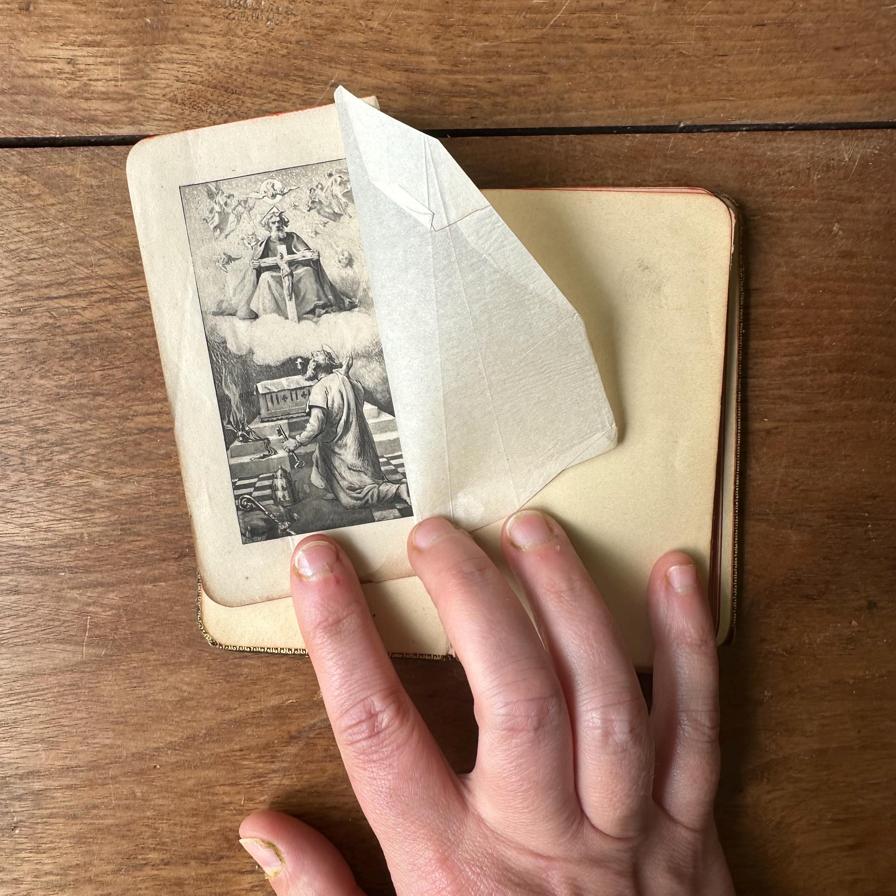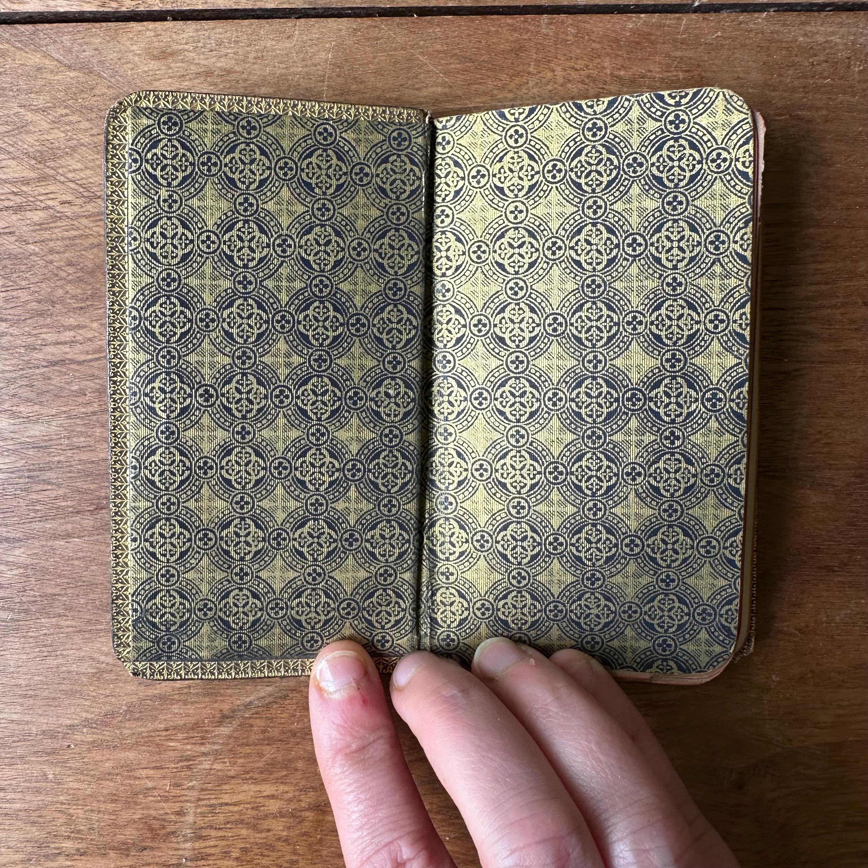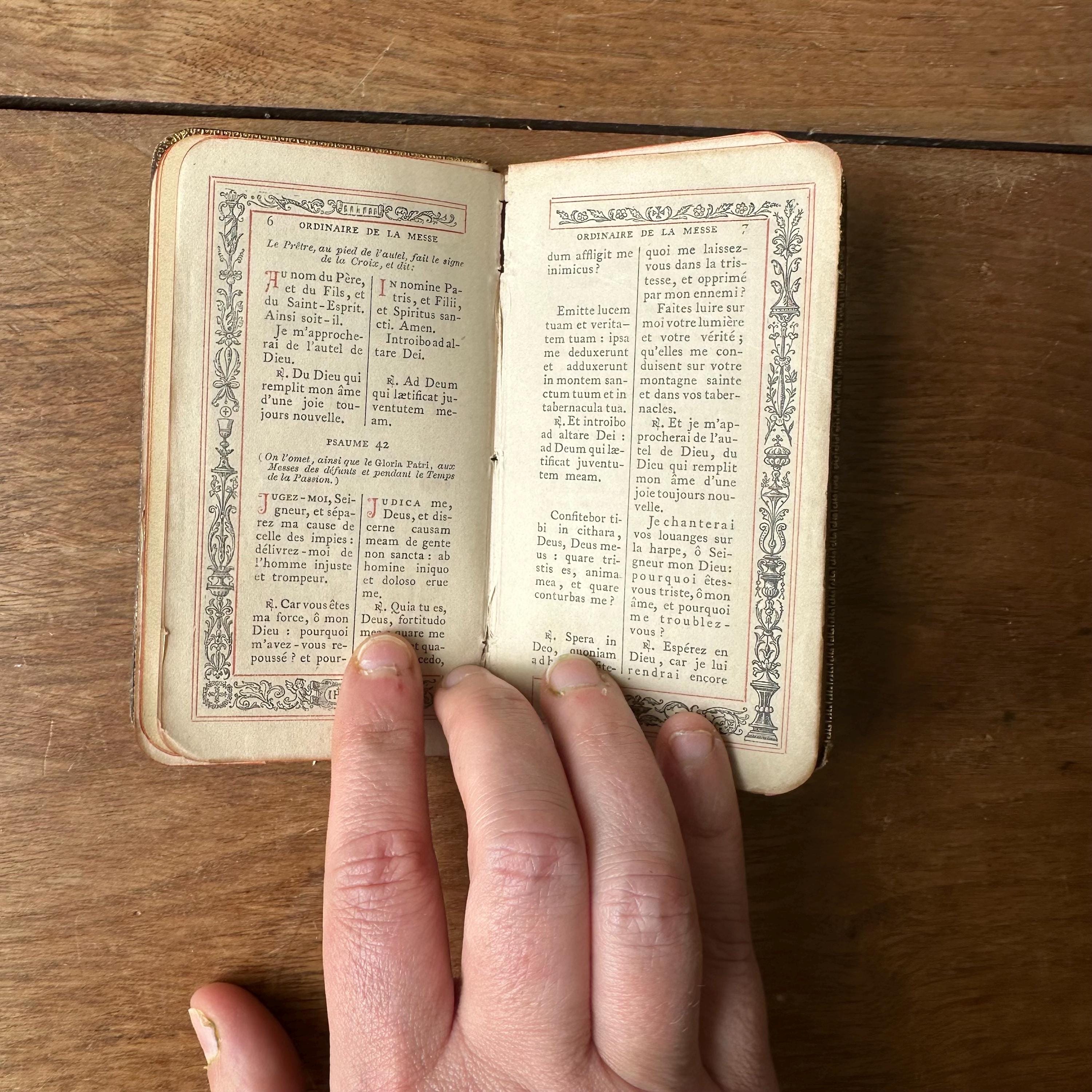 This is an antique, miniature, French language Petit Missel Romain No. 17, published in Tours by Alfred Mame et Fils. It is brown leather with gold lettering on the cover and spine. The endpapers are gorgeous gold medallions on black with gold tooling around the edge. There is one black and white illustration plate at the title page. Each page is also illustrated with a black and white floral illustrations in red border lines. There are 96 gilt-edge pages.